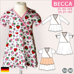 Das Modell „Becca“ ist tailliert geschnitten, hat ein Wickeloberteil und eine A-Linienform, die locker zum Saum hin ausläuft. Du kannst es als Kleid (knieumspielend oder 2-lagig) oder als hüftlanges Shirt nähen.