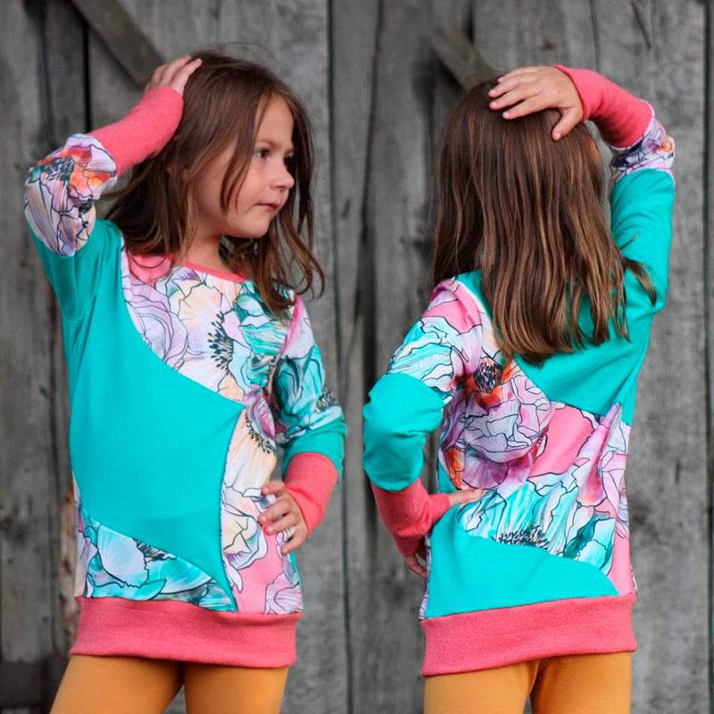 Ein Pulli darf in dieser Serie natürlich nicht fehlten - mit ihm könnt ihr euch ganz lässig durch kühlere Zeiten nähen. Mit Tasche und Kapuze für die coolen Surferkids? Oder lieber mit Kragen für den nächsten Verwandschaftsbesuch? Oder doch lieber andersherum? Mit dem Cool-Curved-Hoodie liegt ihr auf jeden Fall richtig - denn er setzt Stoffe und Kinder einfach ganz wunderbar in Szene. Selbstverständlich erwartet euch auch hier ein kleiner Strauß an Ärmel-, Kragen- und Taschenvarianten, die den Schnitt wunderbar vielfältig werden lassen.