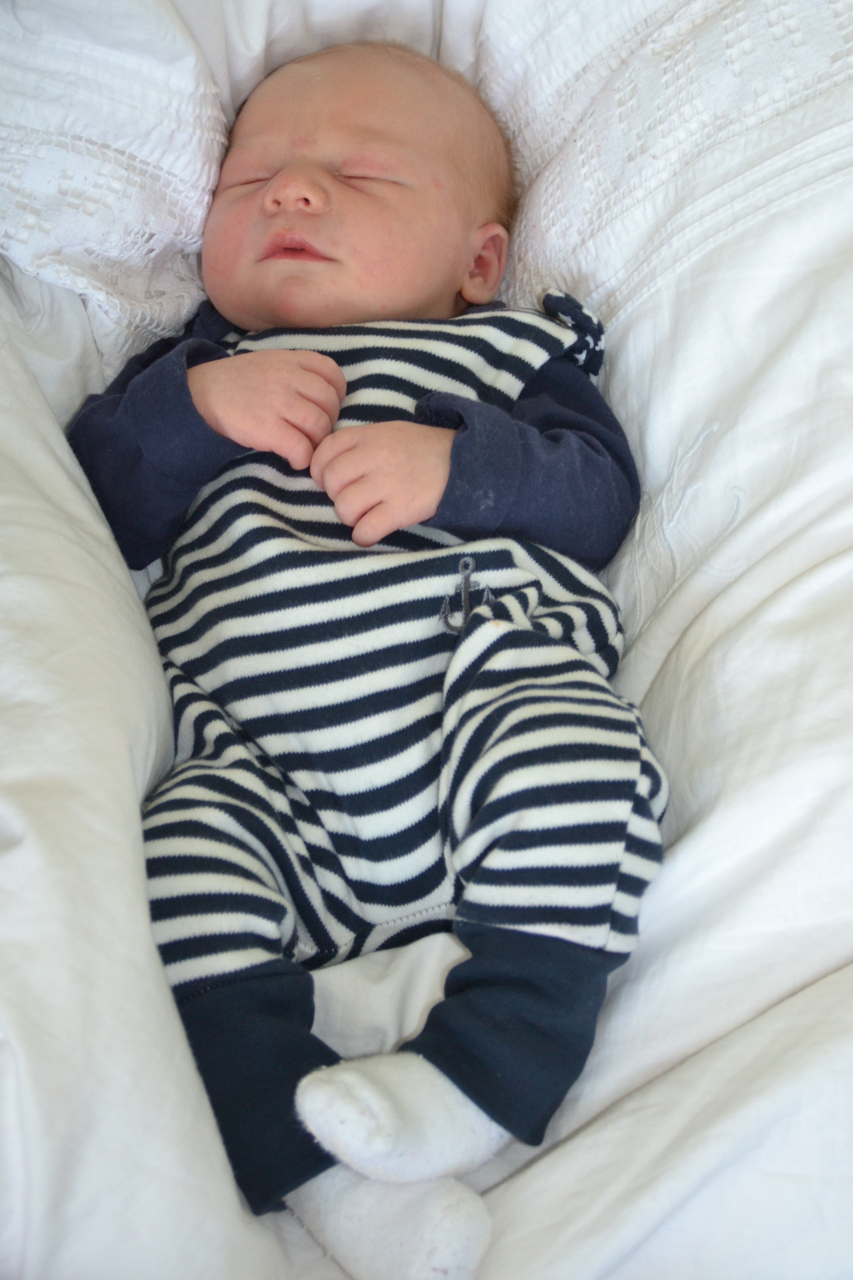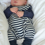 Die Beinbündchen sind etwas verlängert, so das er ein wenig mitwachsen kann. Du kannst sie anfangs krempeln und später lang lassen.