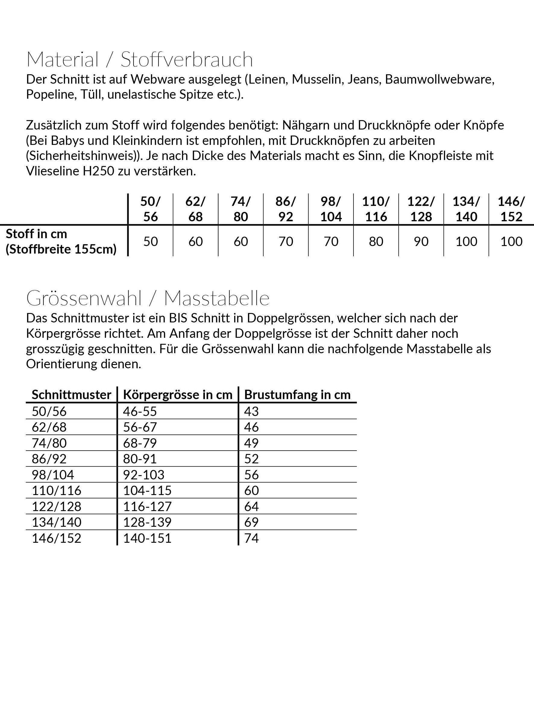 - Stoffempfehlung: Musselin, Popeline, Leinen, leichte Webwarestoffe, Jeans, Tüll