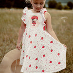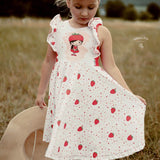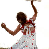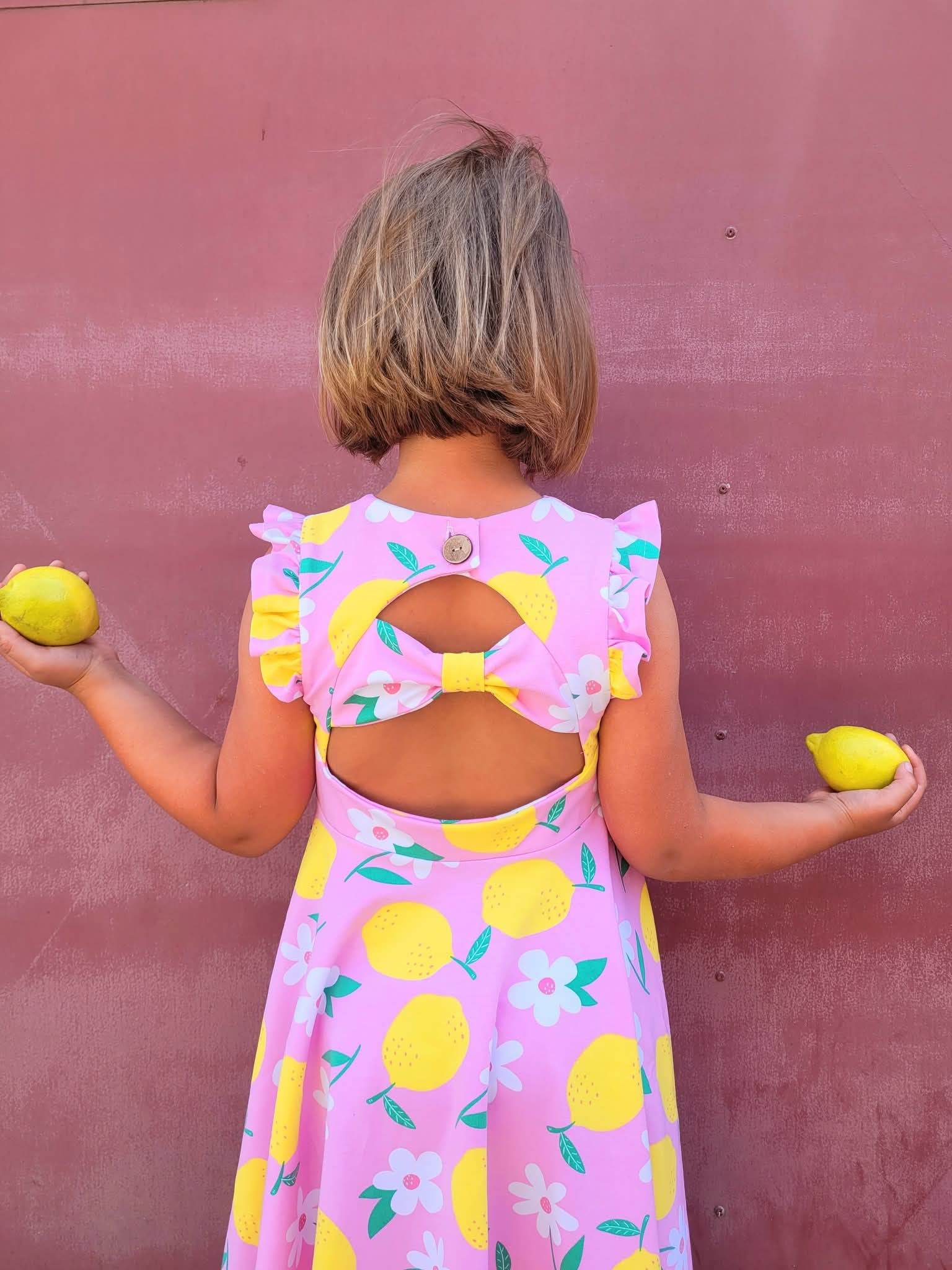 Das Kleid wird mit kleiner Knopfleiste auf dem Rückteil genäht. Die gerafften Flügelärmel sowie die Schleife sind optional.