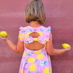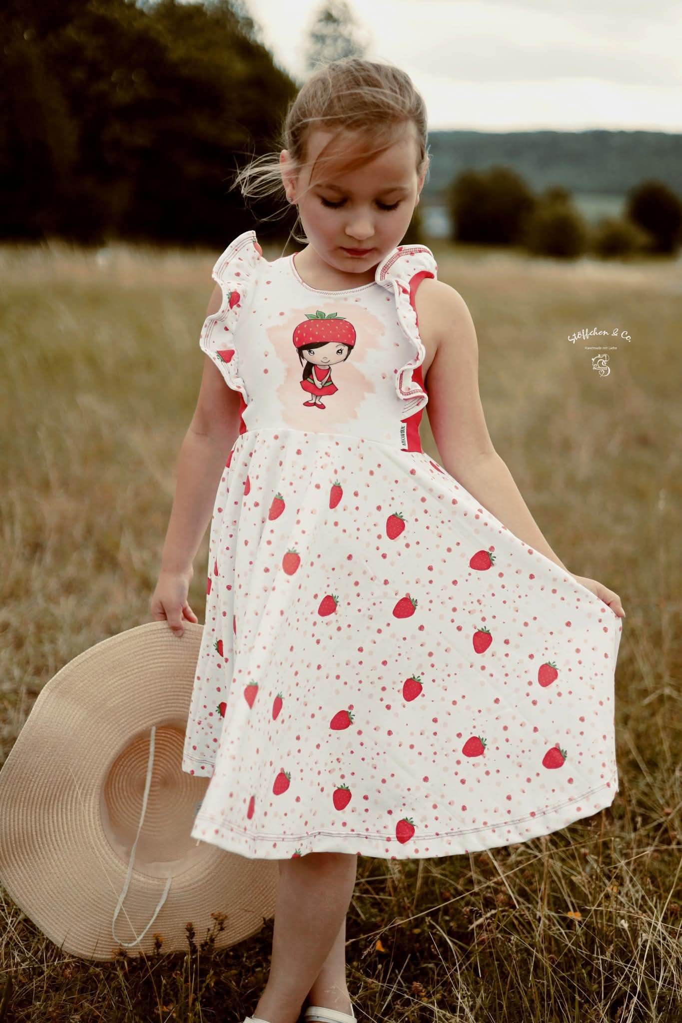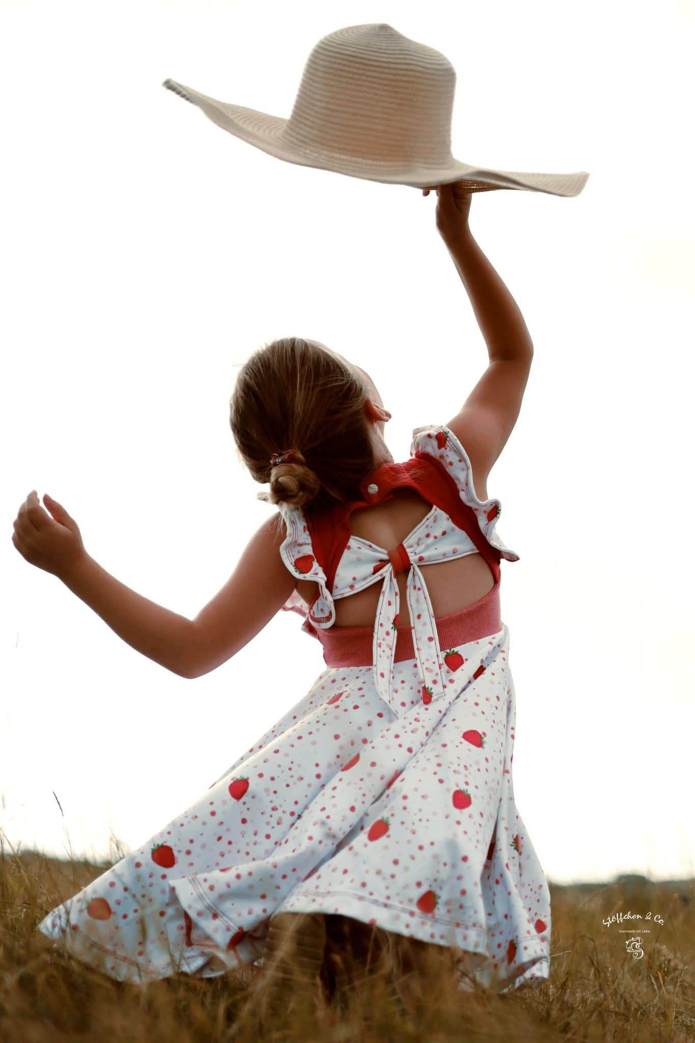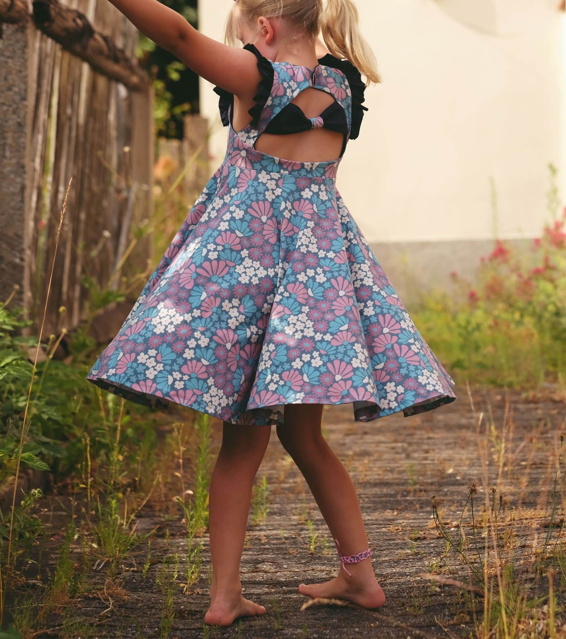 Hierbei handelt es sich um ein Schnittmuster inklusive bebilderter Nähanleitung für ein Drehkleid mit dekorativen Rückenausschnitt in den Einzelgrößen 104, 110, 116, 122, 128, 134 und 140.