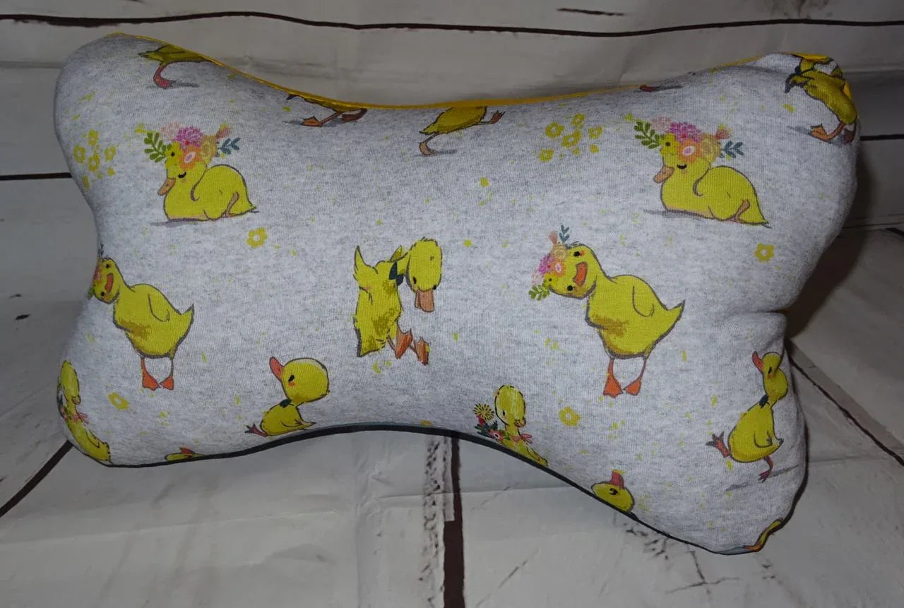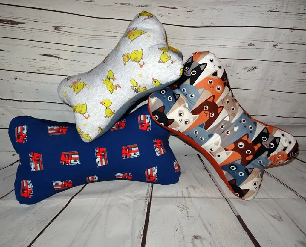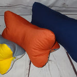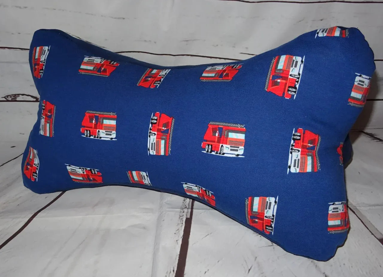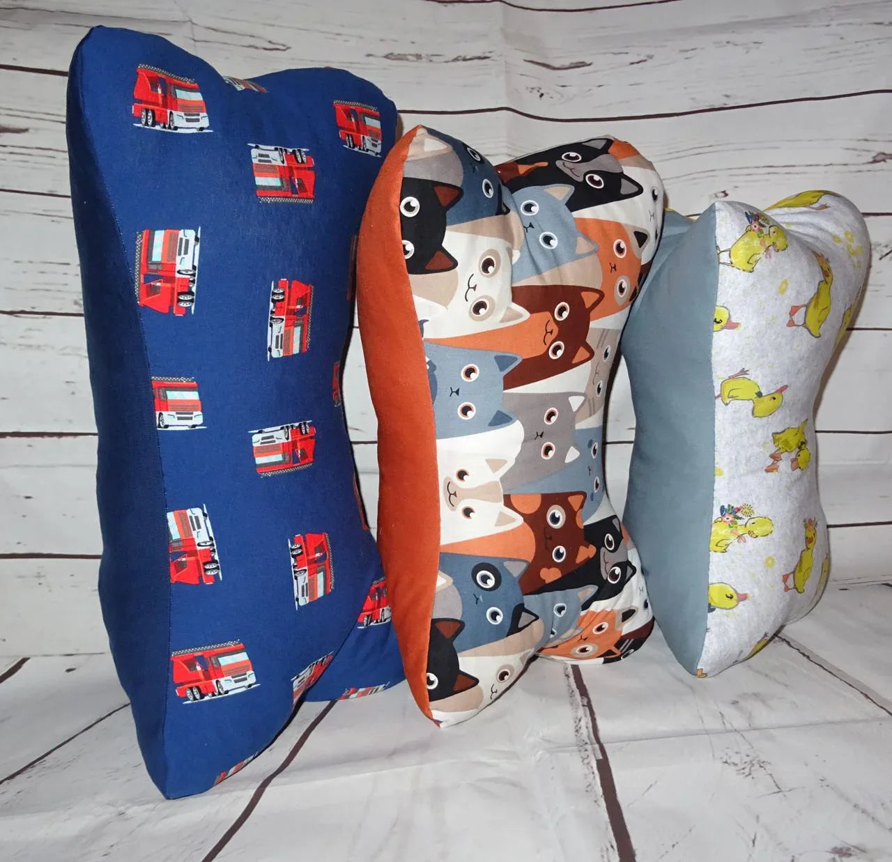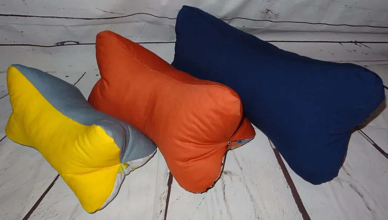 Ein Kissen in Knochenform dient als Kopfstütze zum Kuscheln oder für ein Schläfchen im Auto.