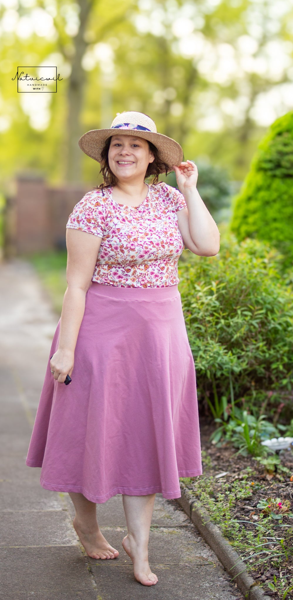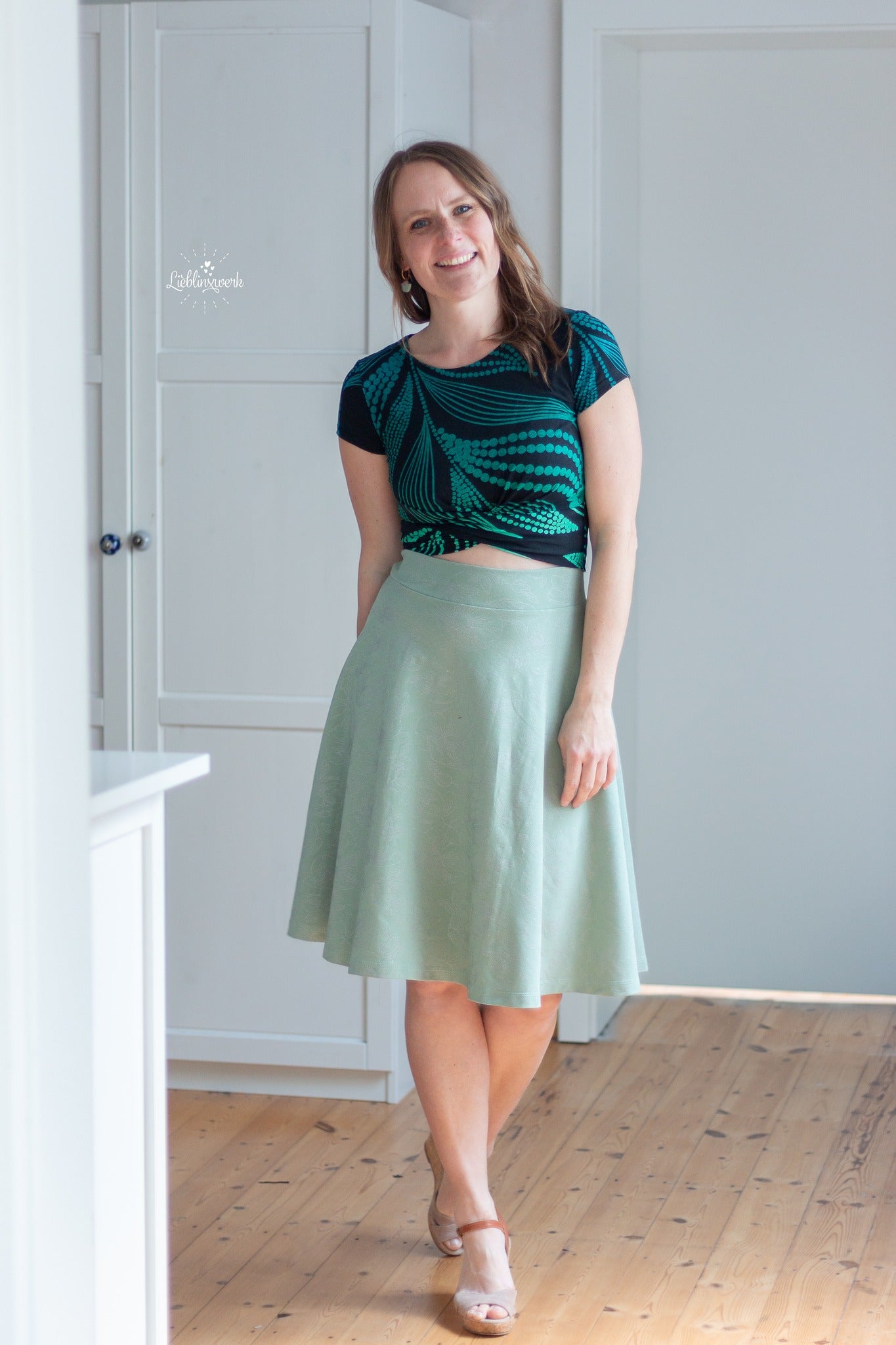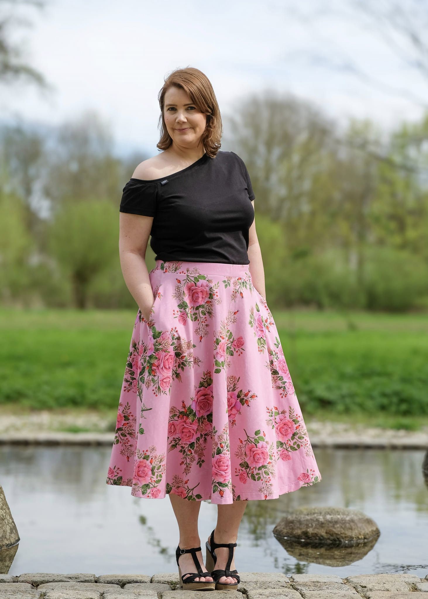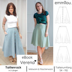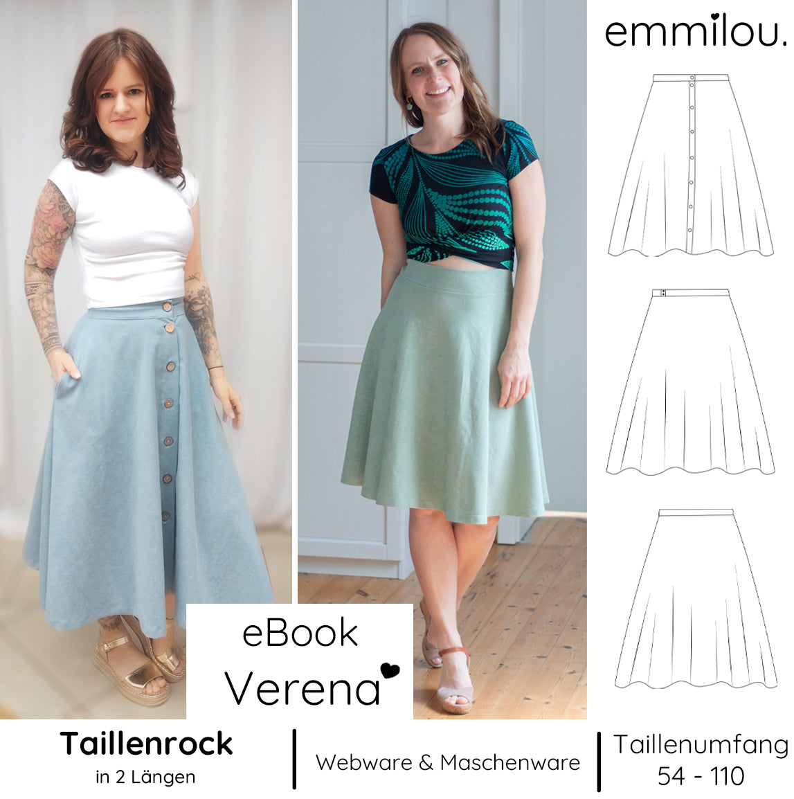 Der Rock „Verena“ ist ein knie- bzw. wadenlanger, schwingender Rock, der in der Taille getragen wird.