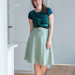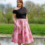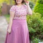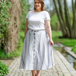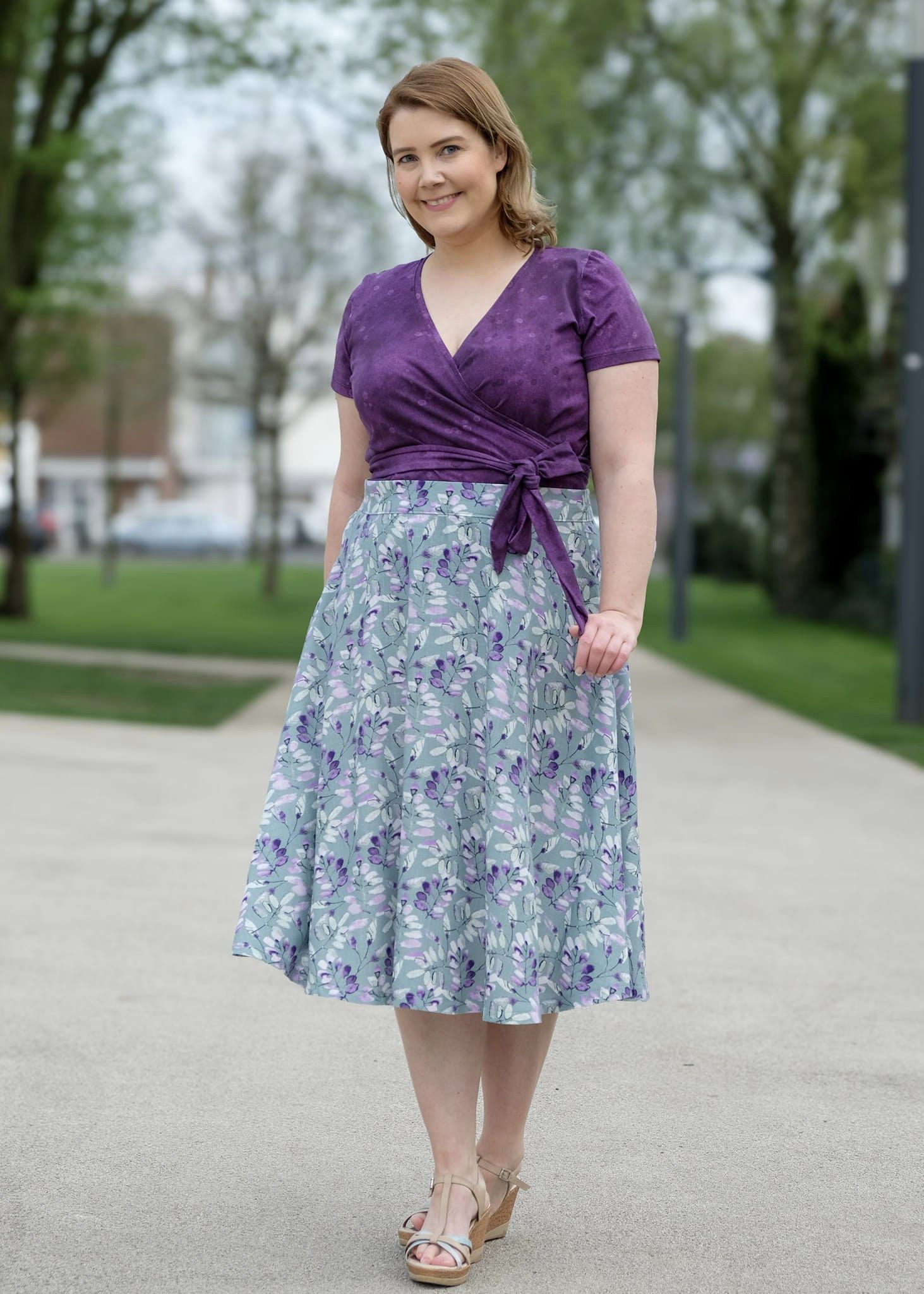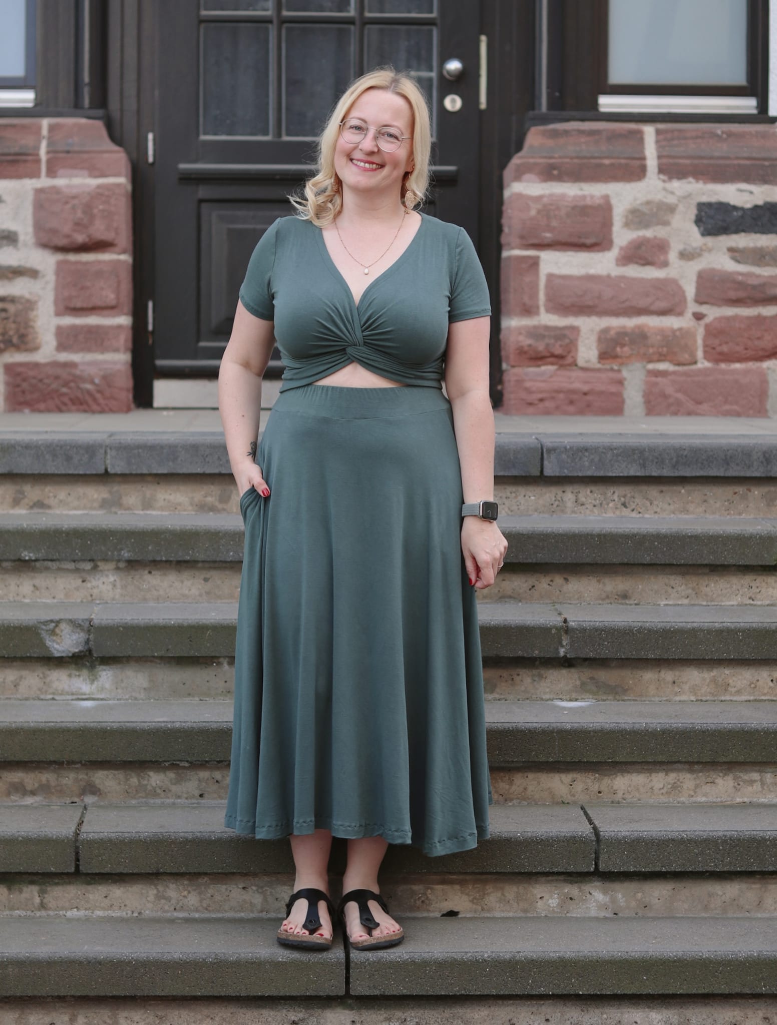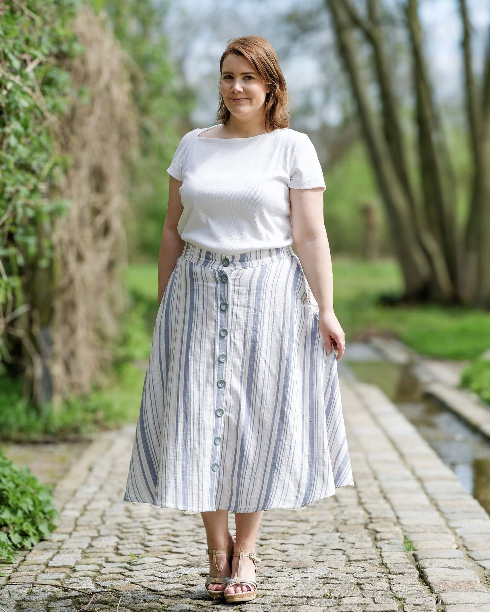 Der Rock „Verena“ ist ein knie- bzw. wadenlanger, schwingender Rock, der in der Taille getragen wird.