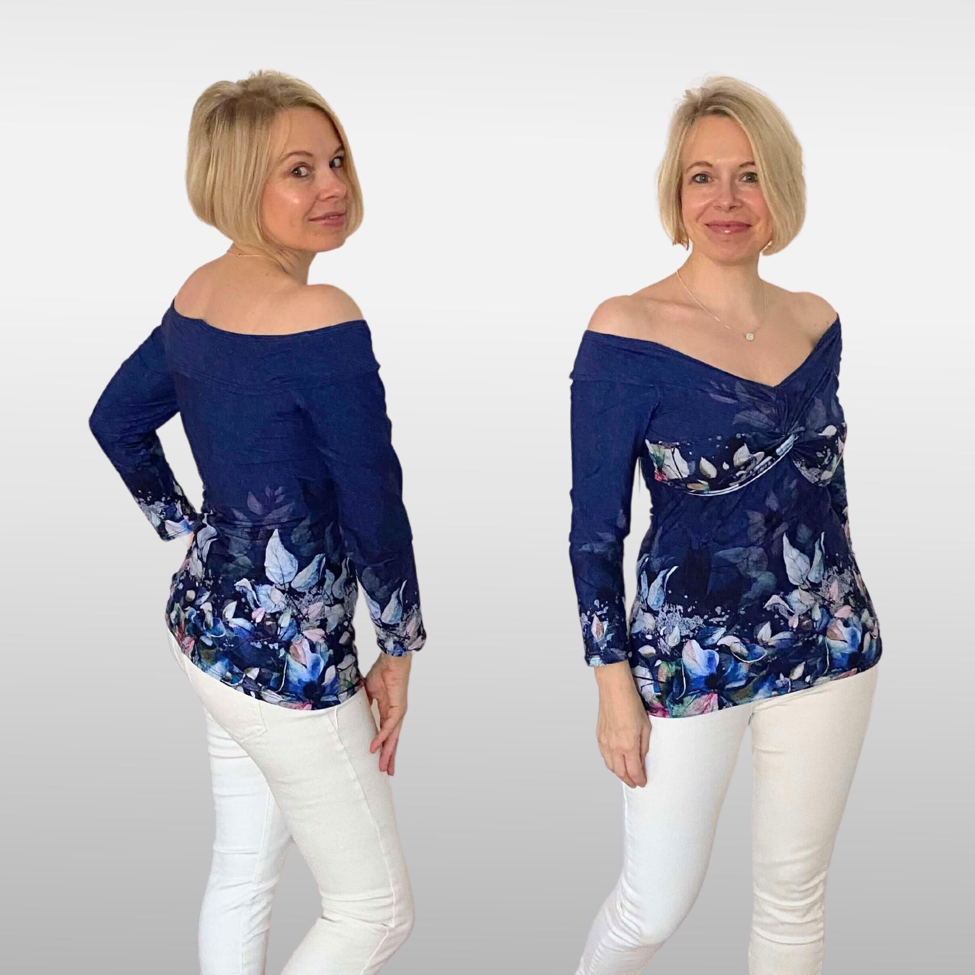 • Besonderer Blickfang ist die Knotenoptik am Oberteil plus Carmen-Ausschnitt