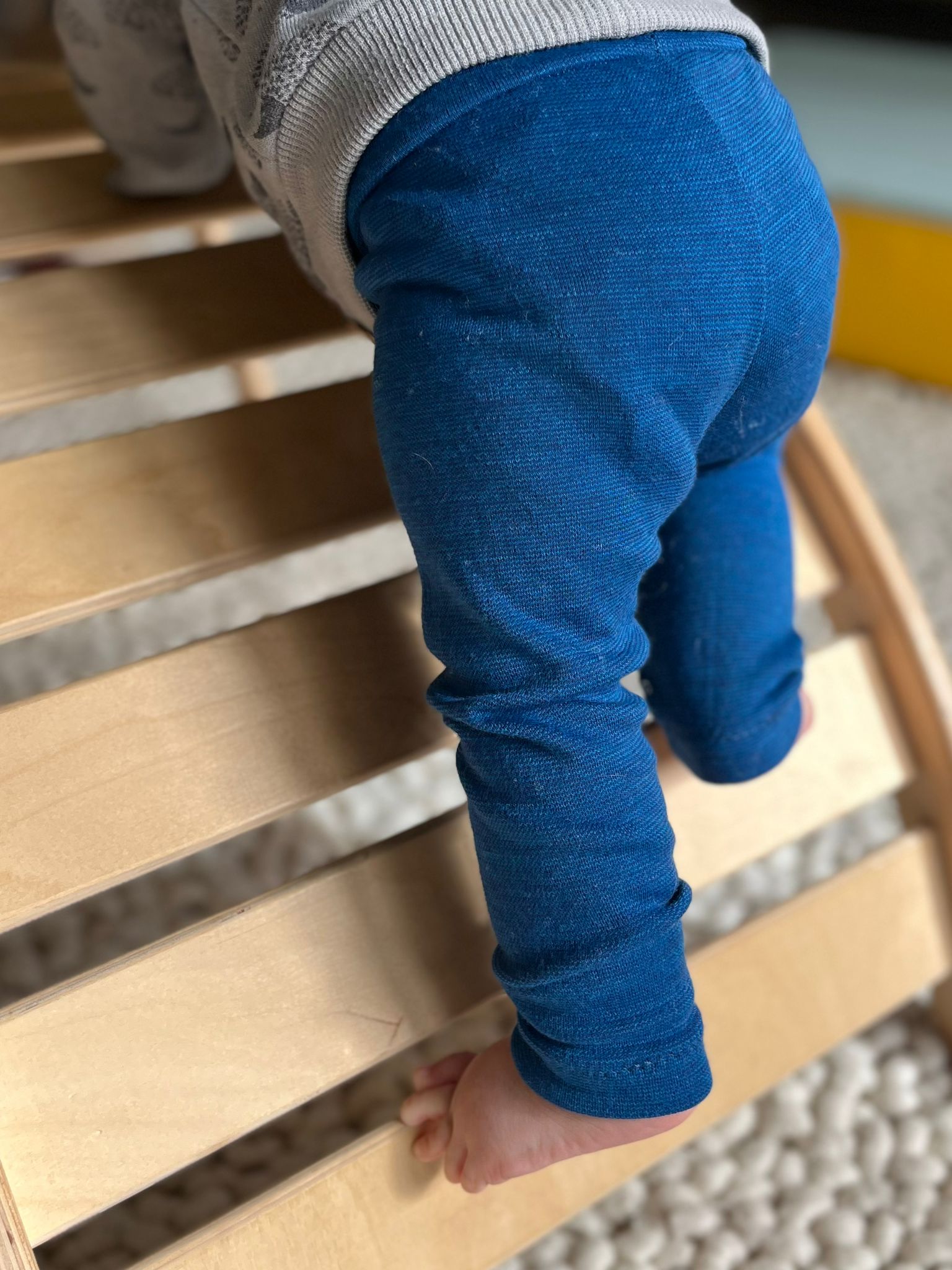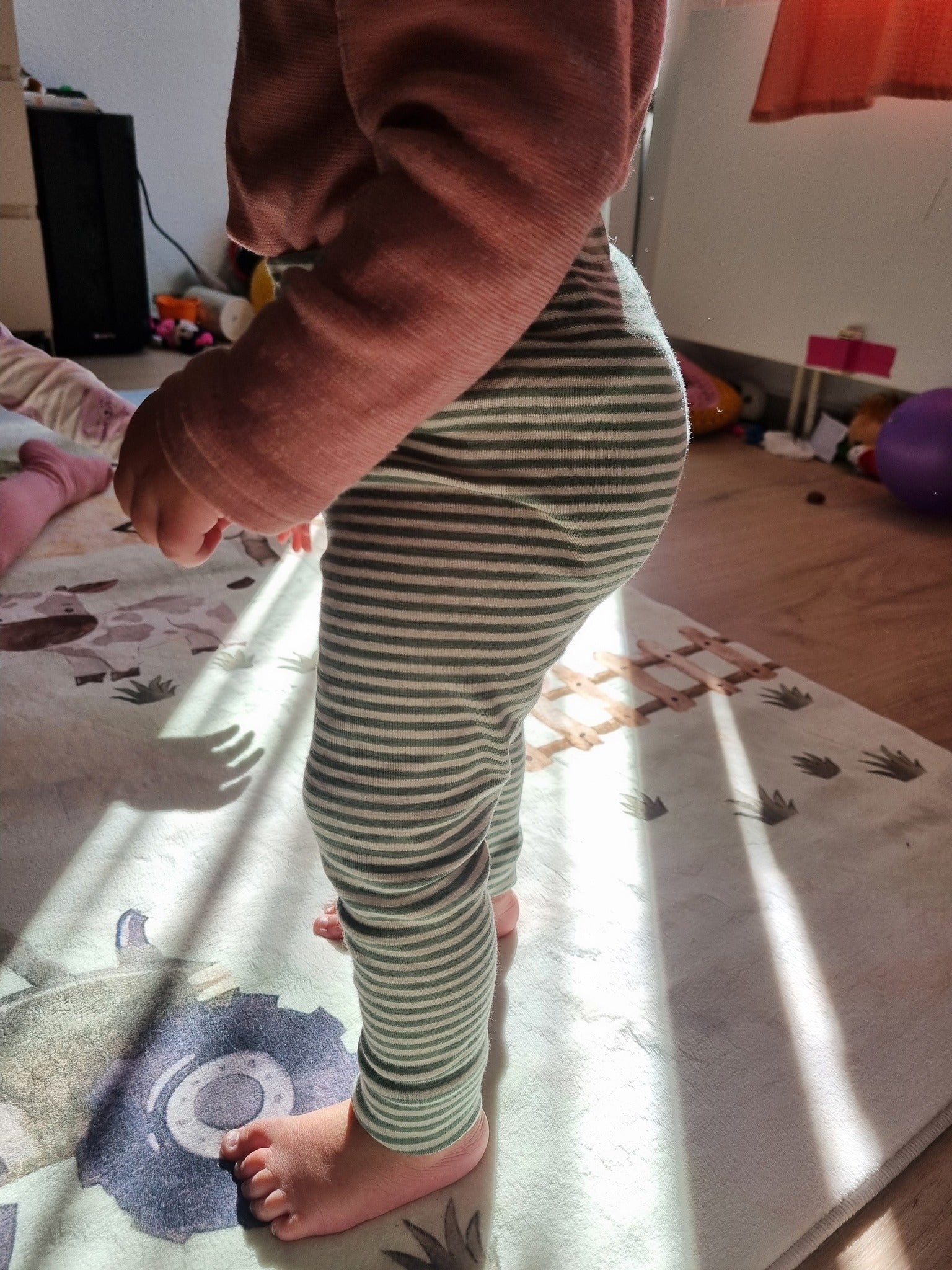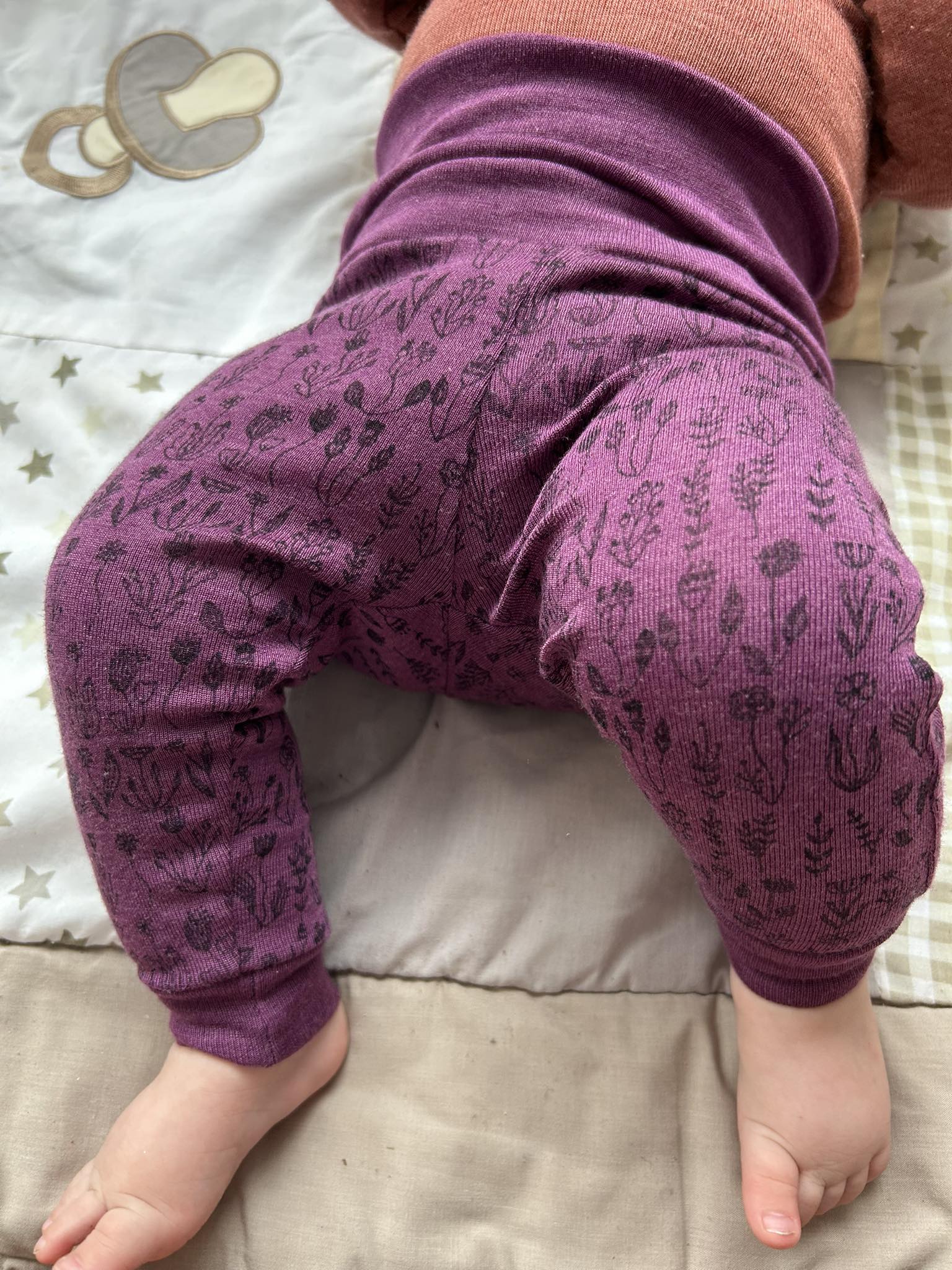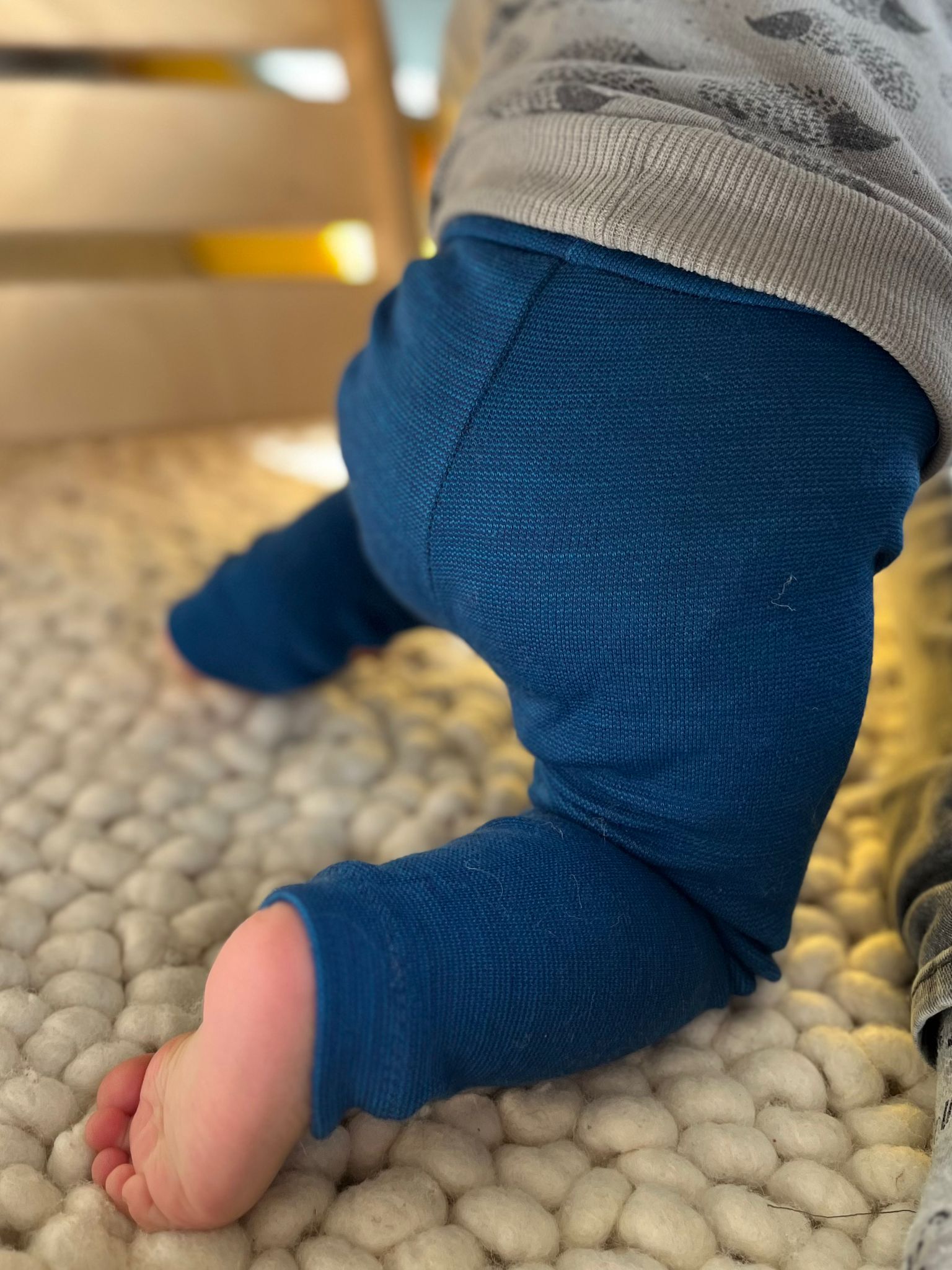 Die Leggings kommt bewusst mit einer eher langen Beinlänge. Da vor allem Babys und Kleinkinder schneller wachsen, ist die Leggings trotzdem über einen längeren Zeitraum tragbar. Auch wenn der Schnitt unter anderem für Wolle-Seide ist, sitzt er nicht „hauteng“ damit ein angenehmes Tragegefühl auf der zarten Babyhaut erhalten bleibt. Die Passform und speziell der hohe Bund eignen sich sowohl für Windeln als auch für dickere Stoffwindeln.