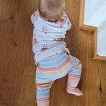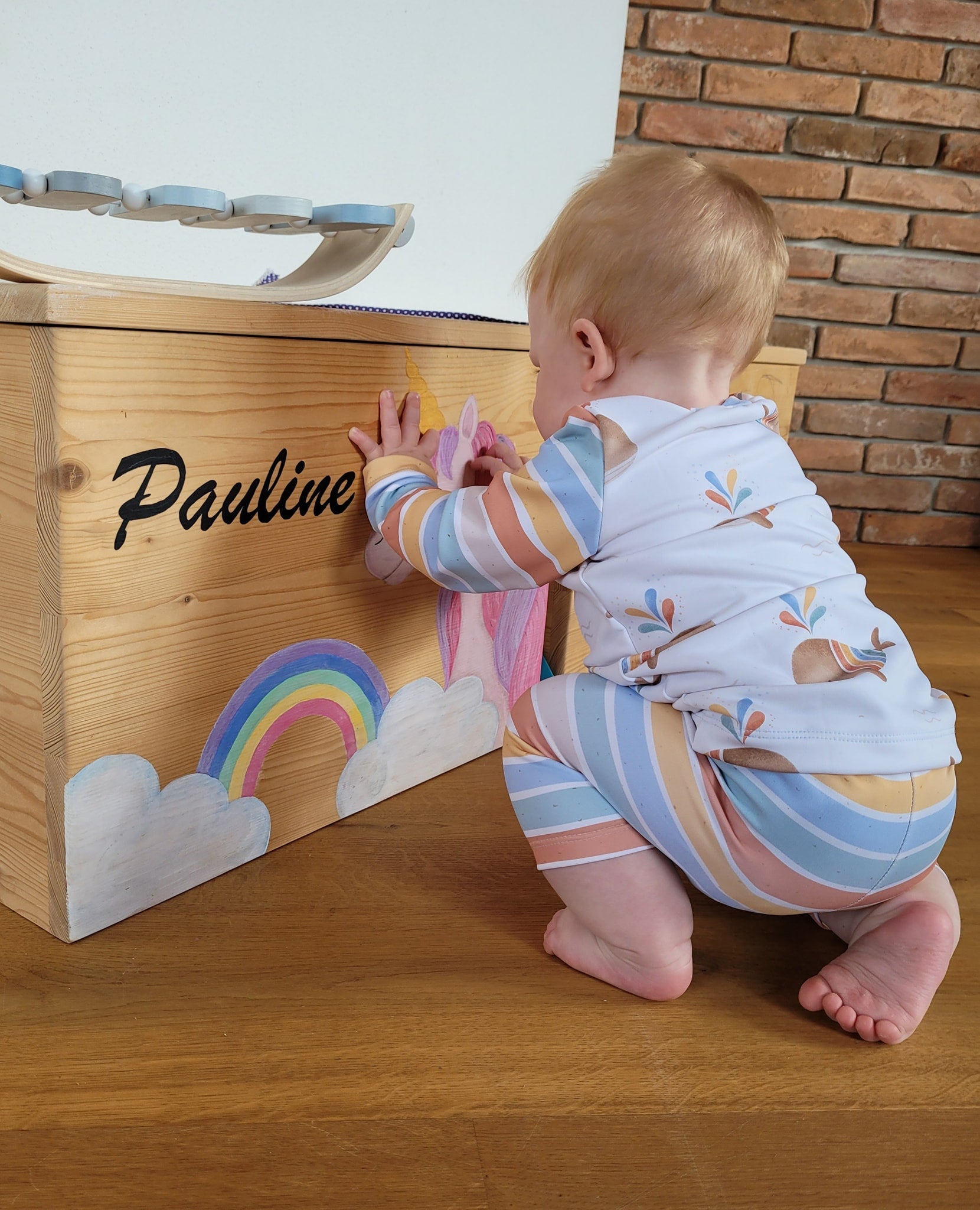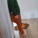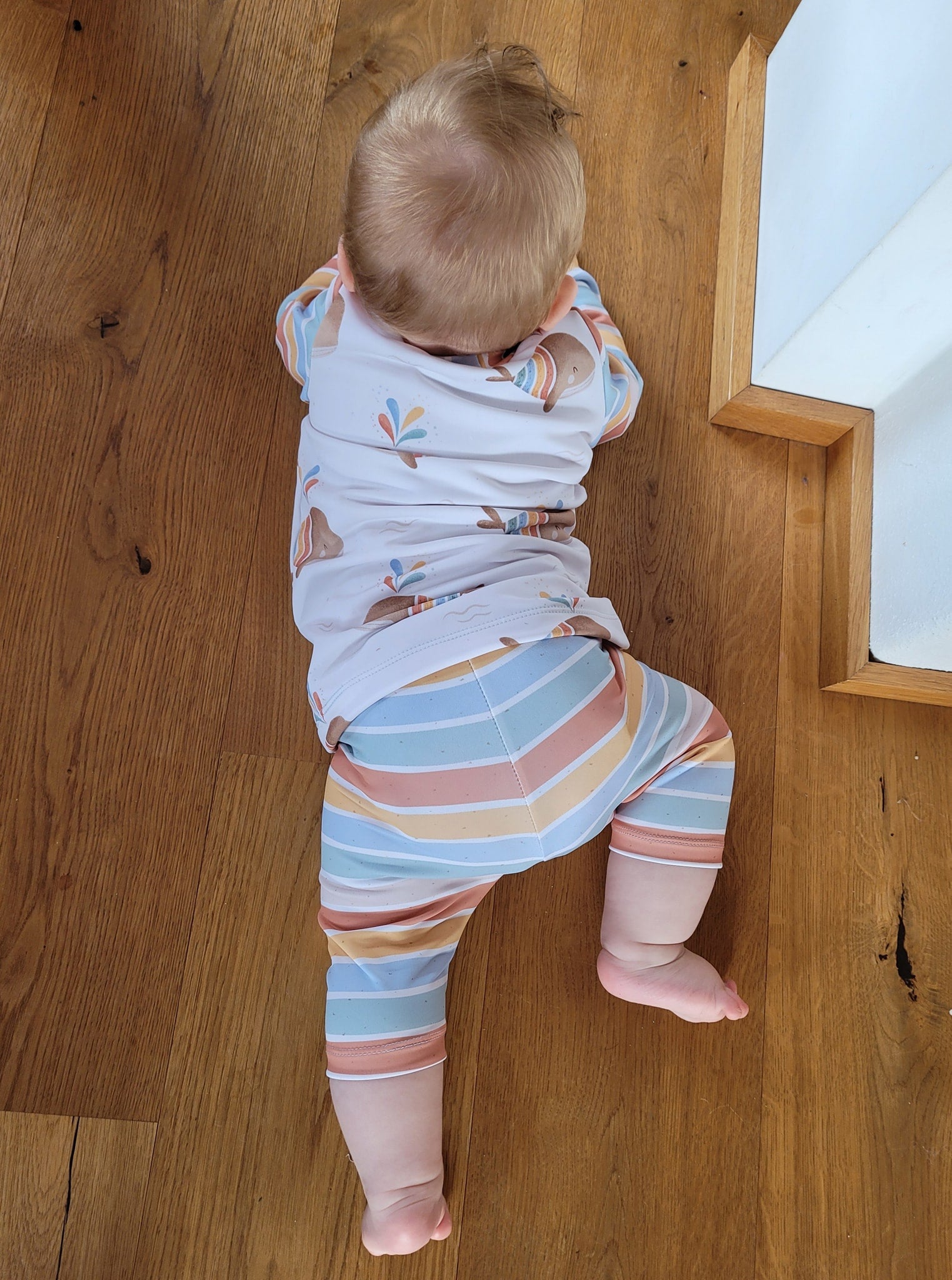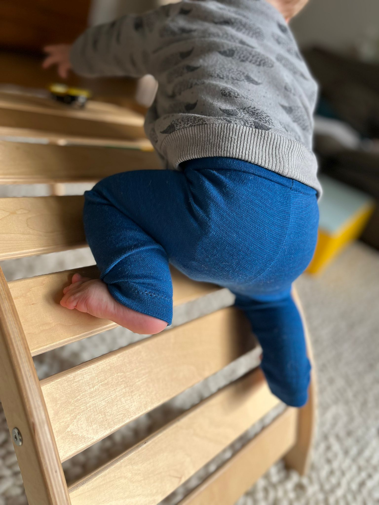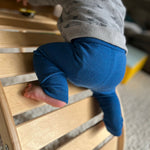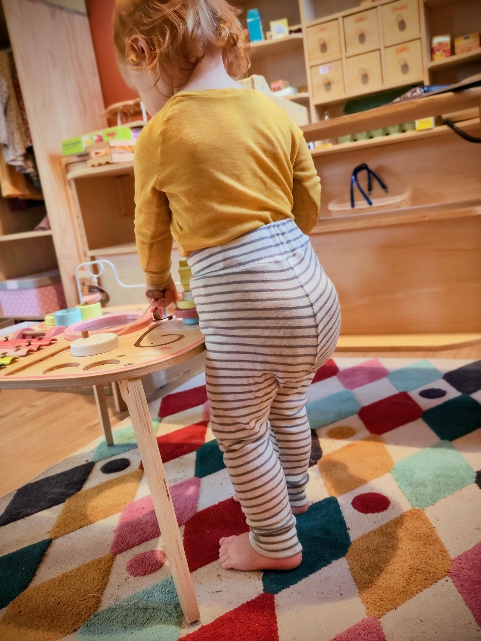 Die Leggings kommt bewusst mit einer eher langen Beinlänge. Da vor allem Babys und Kleinkinder schneller wachsen, ist die Leggings trotzdem über einen längeren Zeitraum tragbar. Auch wenn der Schnitt unter anderem für Wolle-Seide ist, sitzt er nicht „hauteng“ damit ein angenehmes Tragegefühl auf der zarten Babyhaut erhalten bleibt. Die Passform und speziell der hohe Bund eignen sich sowohl für Windeln als auch für dickere Stoffwindeln.