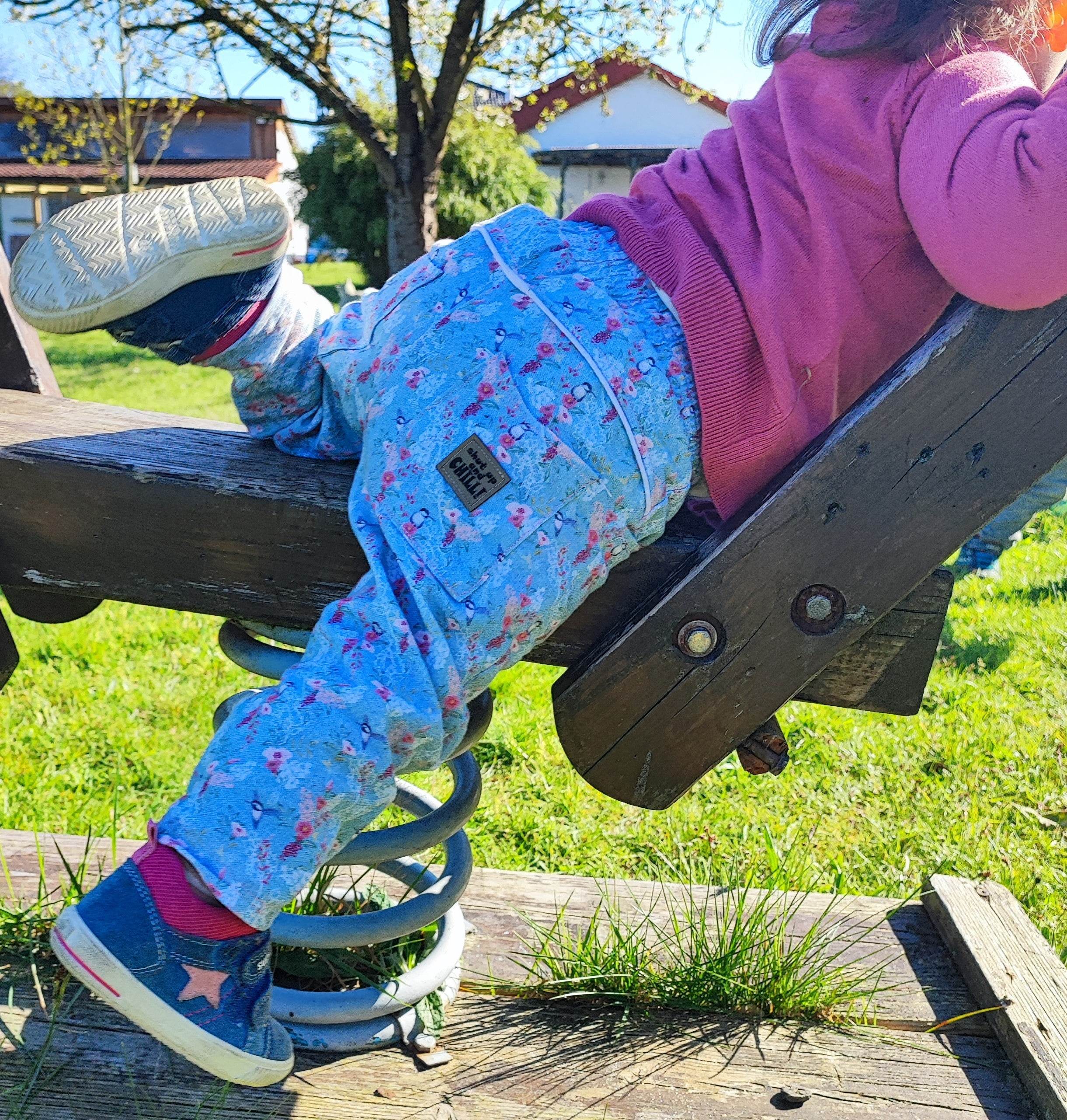 Durch die auffälligen Patches in Form von z.B. einem Schmetterling oder einem Herz ist sowohl für eine funktionale Knieverstärkung als auch für einen coolen Look gesorgt. Selbstverständlich kann man die Hose auch ohne die Applikation nähen.