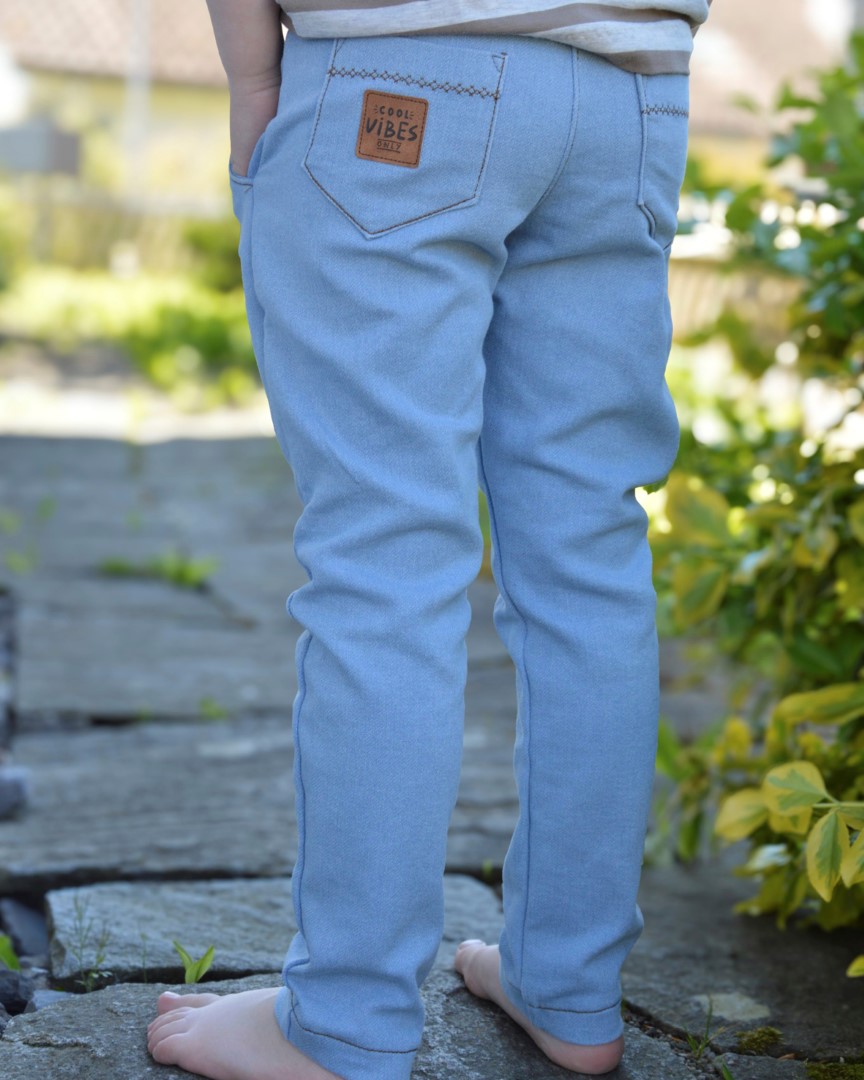 Die Hose ist für (leicht) dehnbare Stoffe wie Jersey, French Terry, Sweat oder Stretch-Jeans ausgelegt.