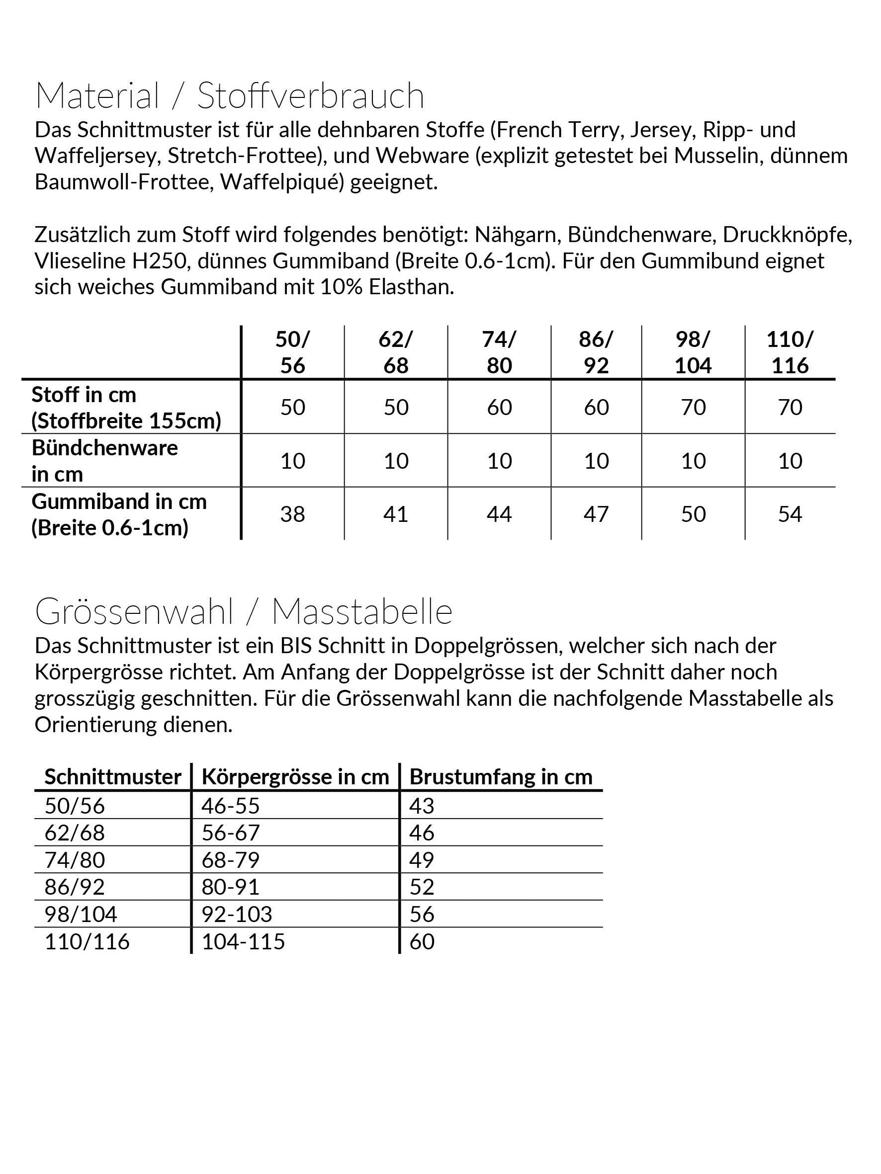 - Stoffempfehlung: Jersey, French Terry, Musselin, Stretch-Frottee