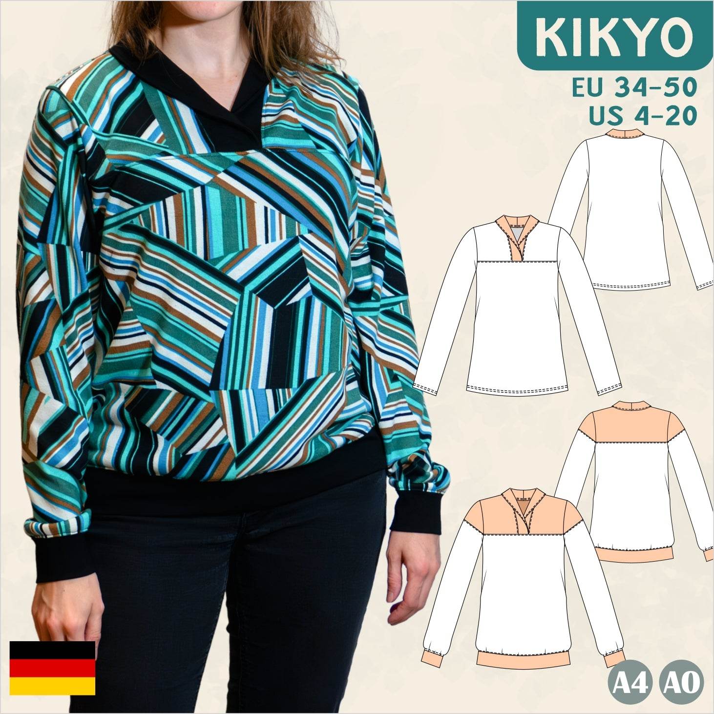 Das Schnittmuster „Kikyo“ ist ein vielseitiger Pullover mit einem Wickelkragen und V-Ausschnitt. Der besondere Kragen sorgt für eine moderne Optik und kann hochgeschlossen oder locker fallend getragen werden.