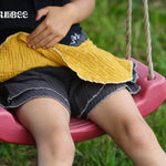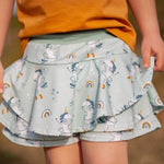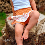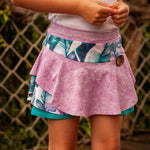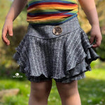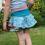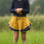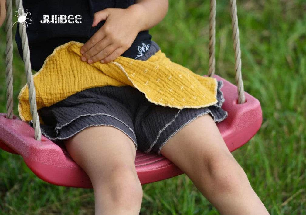 Er wird dreilagig genäht und schwingt schön bei Bewegung. Optional kann er auch zweilagig oder einlagig als kurze Hose genäht werden. Das Vorder- und Rückteil wird jeweils mit einer Teilung genäht.