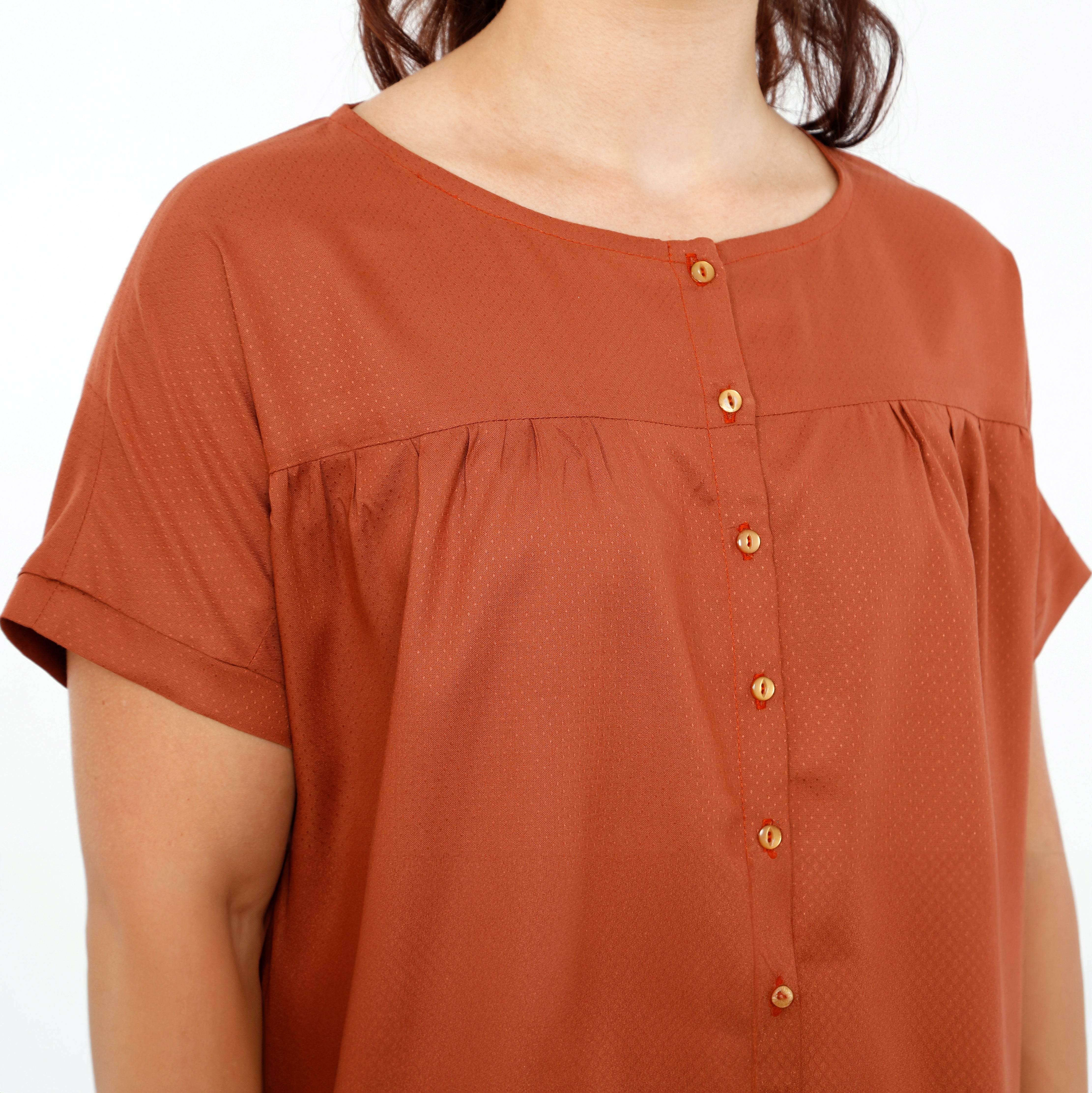 FRAU SUZY schafft den Spagat zwischen lässig und romantisch mit Leichtigkeit! Die luftige Bluse mit kurzem Fledermausärmel erzeugt durch eine Kräuselung in Vorder- und Rückenteil eine angenehme Weite. Mit der Knopfleiste in der vorderen Mitte, dem Rundhalsausschnitt und dem Ärmelabschluss, ist sie perfekt für Büro oder Party.