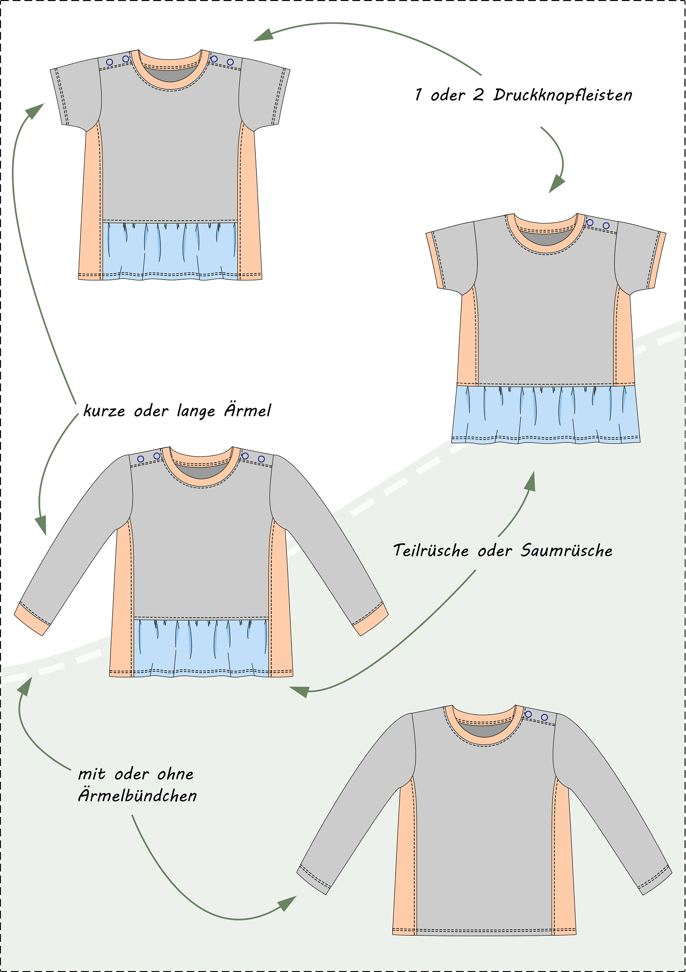 Im Schnitt sind gerade Ärmel in kurz oder lang enthalten – wahlweise mit Saumbündchen oder einfacher Saumverarbeitung. Damit das Anziehen leichter fällt, kannst du zwischen einer oder zwei Knopfleisten an den Schultern wählen – ideal auch für kleine Nähanfänger.