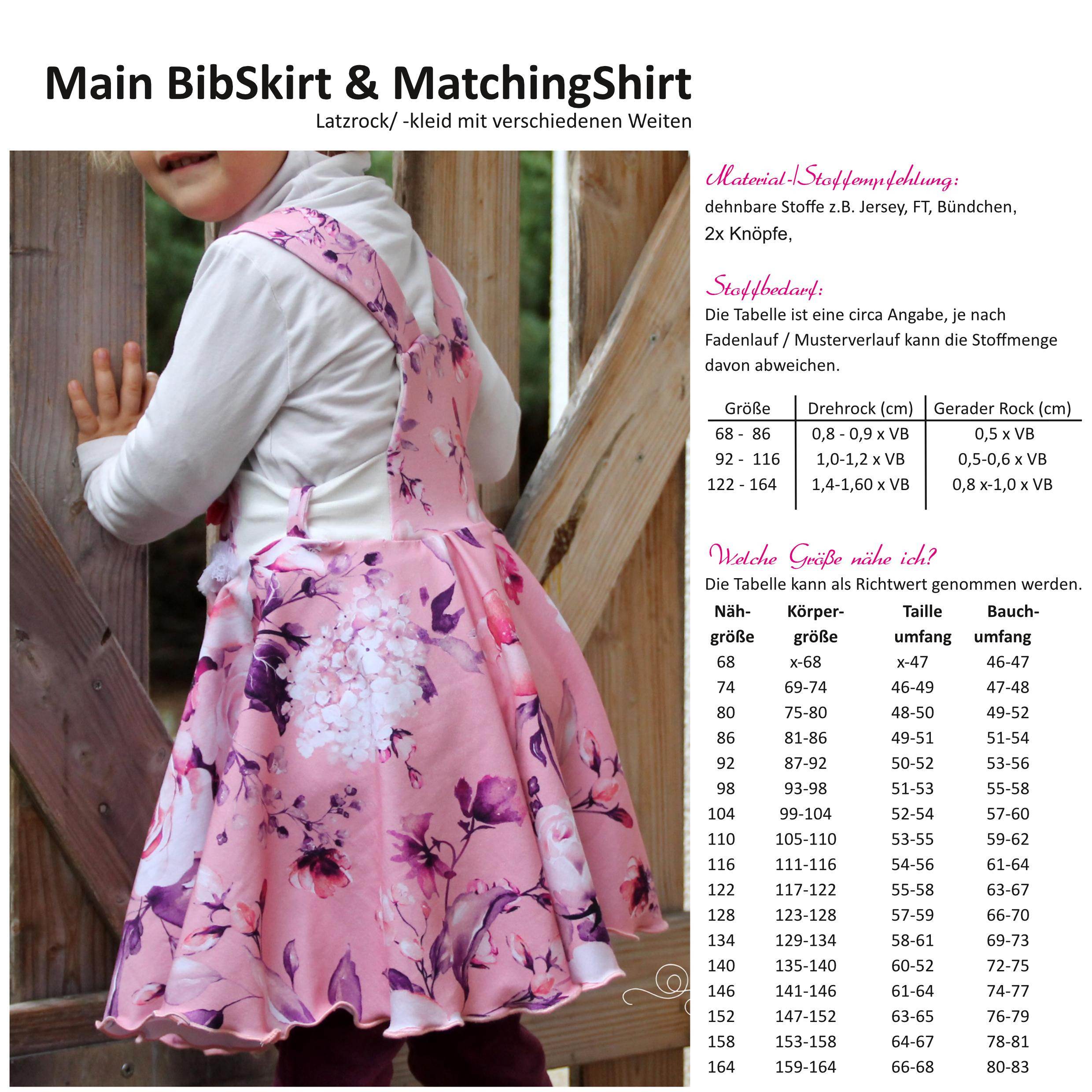 Main BibSkirt ist ein Schnittmuster für einen Latzrock / Latzkleid und einem Überzieh-Shirt, welche aus dehnbaren Stoffen genäht werden.