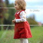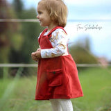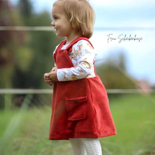 Die seitliche Dehnung kann wahlweise auch als Schleifenvariante genäht werden. Durch diesen seitlichen Teil kann das Kleid optimal, auch von Anfängern, auf die perfekte Breite des Kindes angepasst werden. Im SM enthalten sind ein Drehrock oder ein enger geschnittener Rock sowie verschiedene Taschenoptionen (Nahttasche für den Rock, Aufsetztaschen für Rock oder Latz) .
