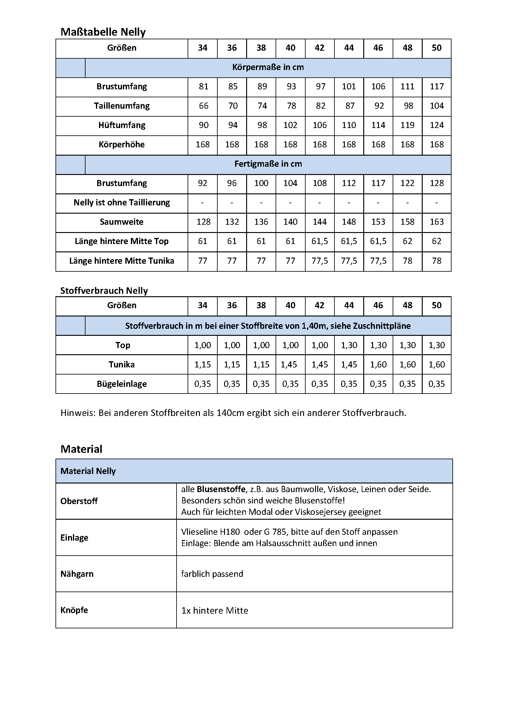 Alle Blusenstoffe, z.B. aus Baumwolle, Viskose, Leinen oder Seide. Besonders schön sind weiche Blusenstoffe, Nelly ist auch für leichte Modal oder Viskosejersey geeignet.