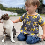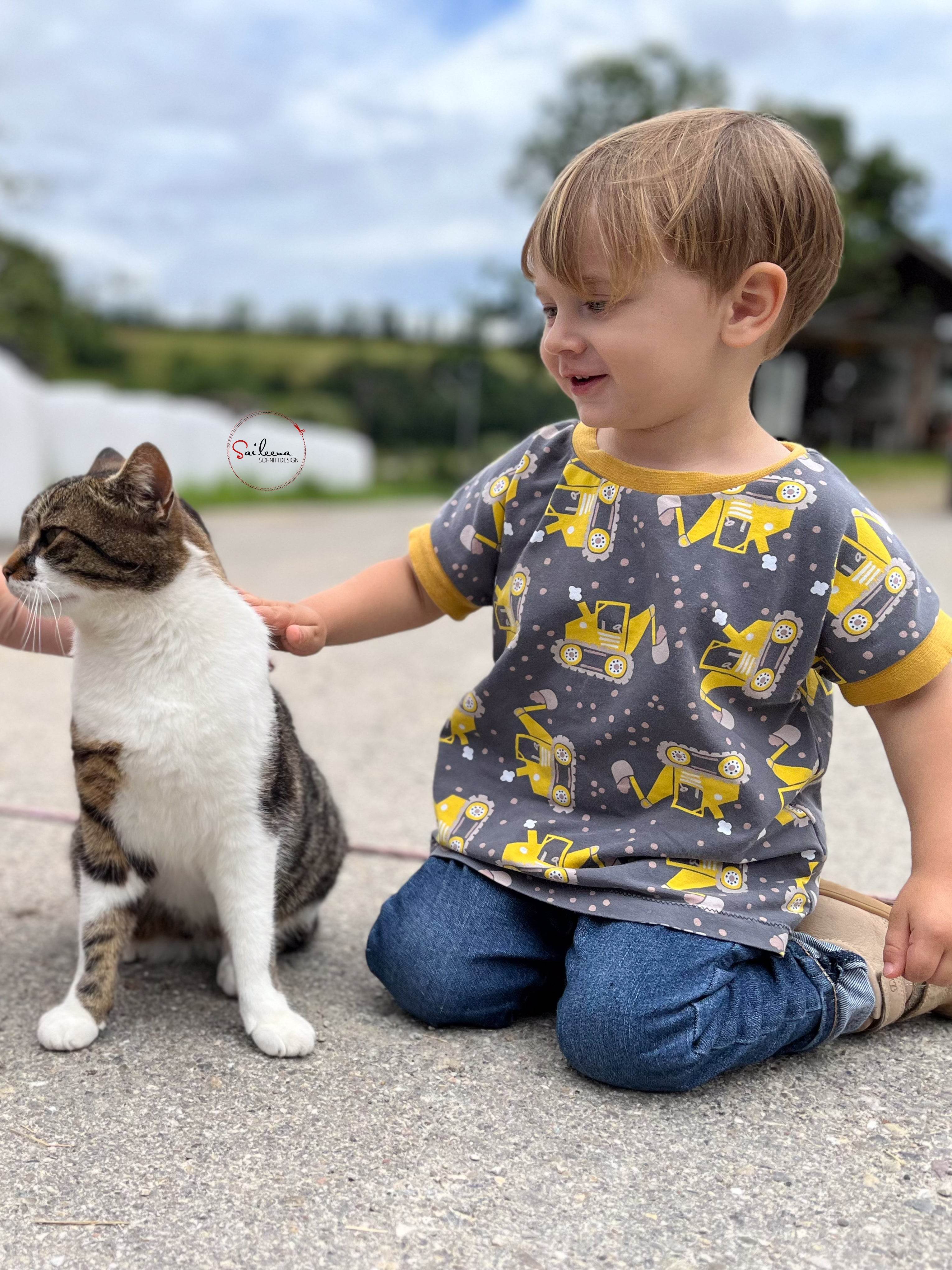 notAcrop ist der länger geschnittene T-Shirt Schnitt aus dem eBook "cropORnot". Das Shirt mit überschnittenen Ärmeln beinhaltet nur zwei Teile und ist daher ultraschnell genäht. Mit der kleinen Brusttasche oder dem Riegel-Abschluss an den Ärmeln wirkt der Schnitt gerade für Jungs besonders cool!