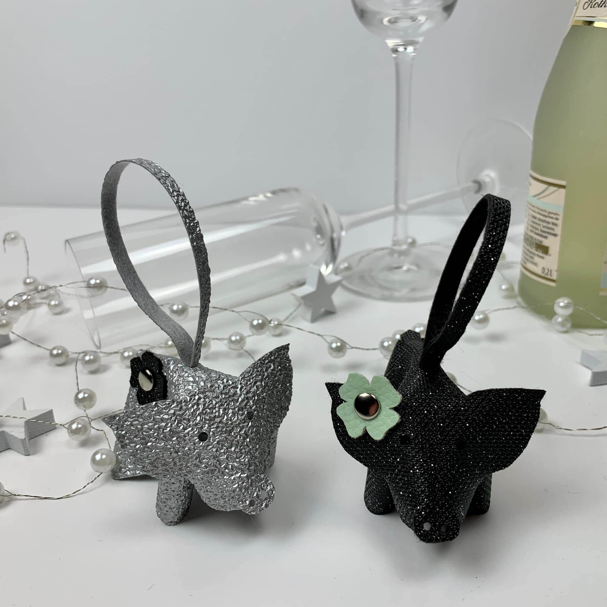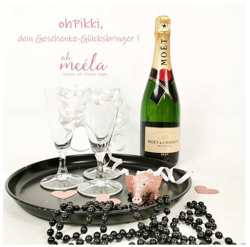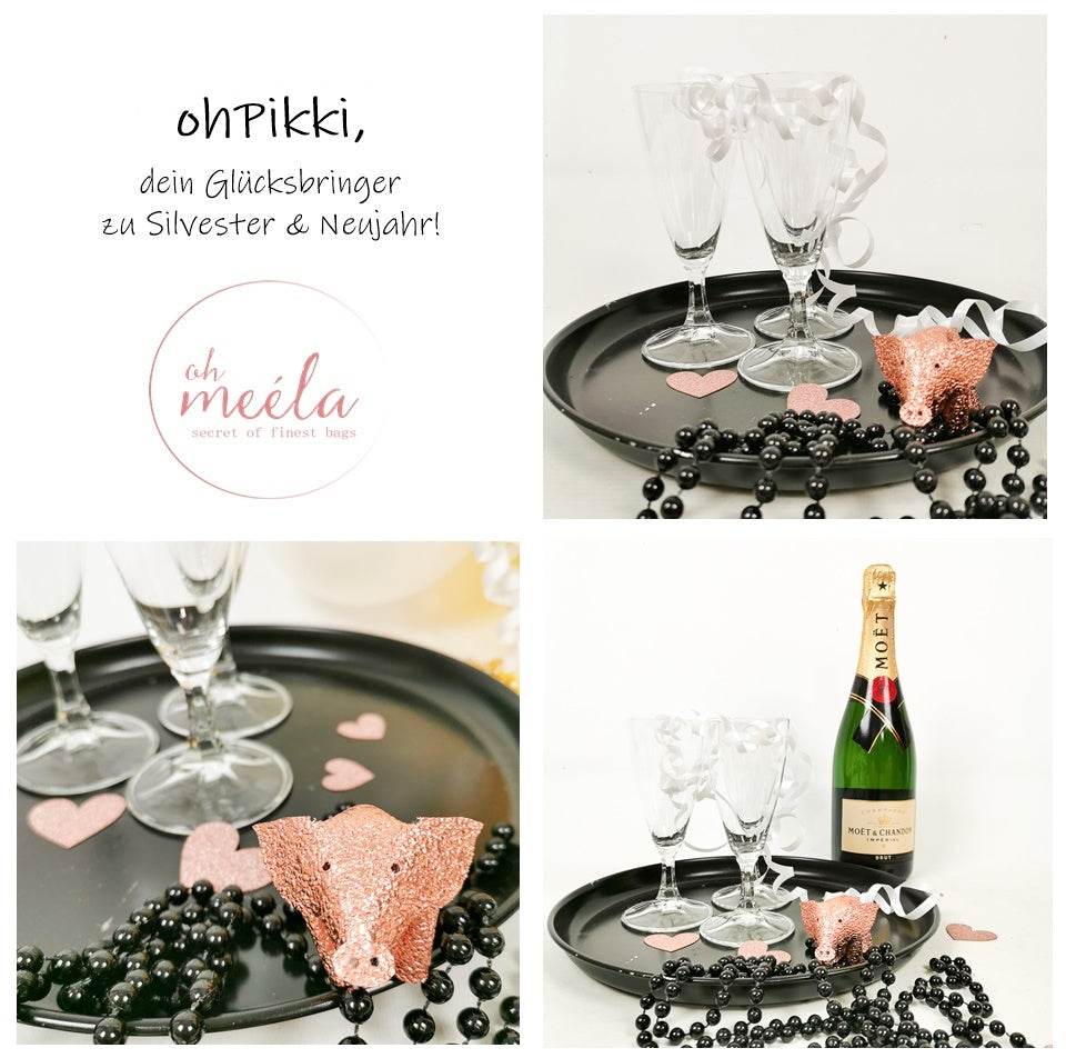 ohPikki hat eine Größe von rund Höhe 4 cm, Breite 5,5 cm und Tiefe 6,5 cm und wird mit einer Kunstlederschnur oder ähnlichem einfach an deine Tasche oder zur Silvesterparty an die Sektflasche gehängt.