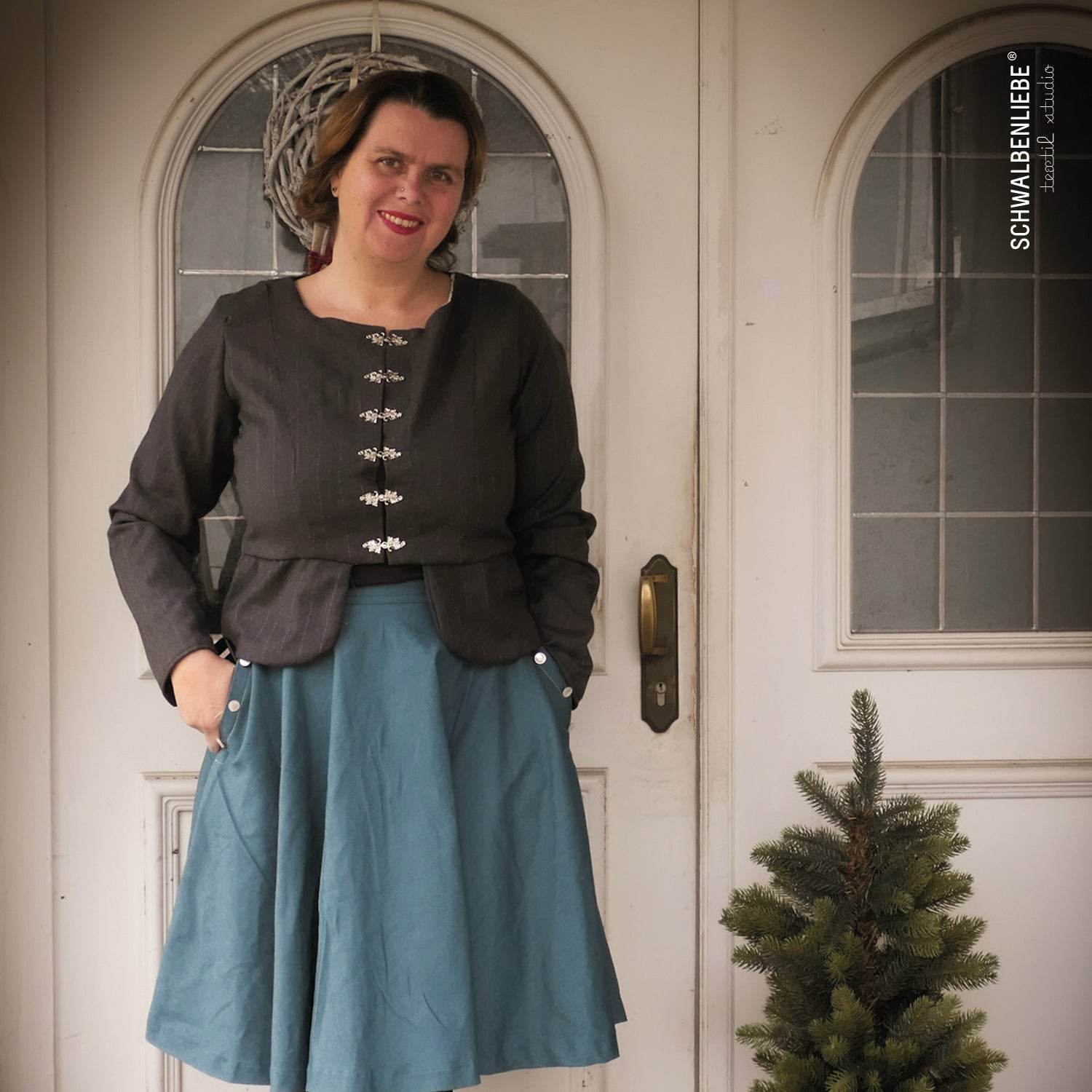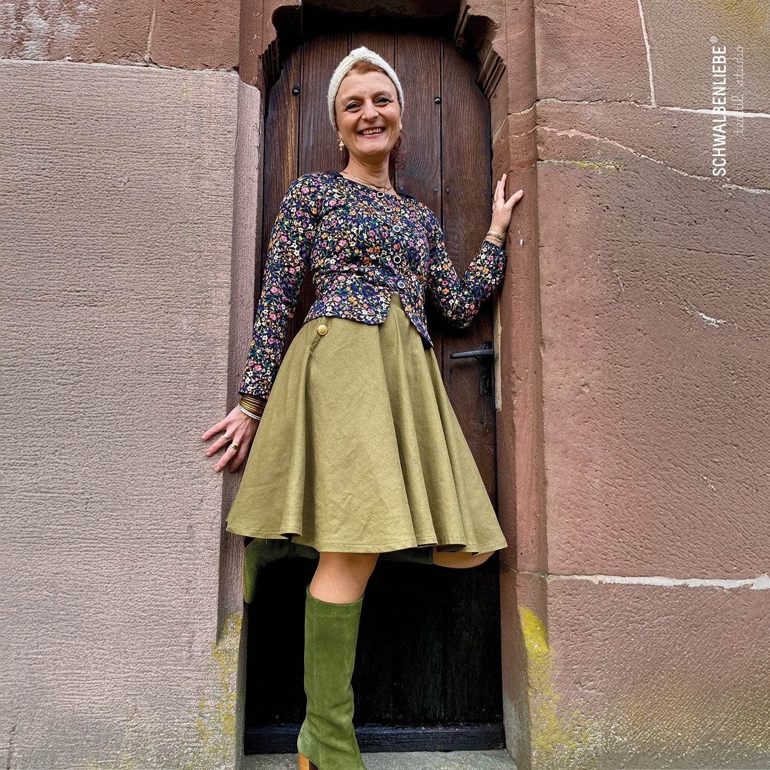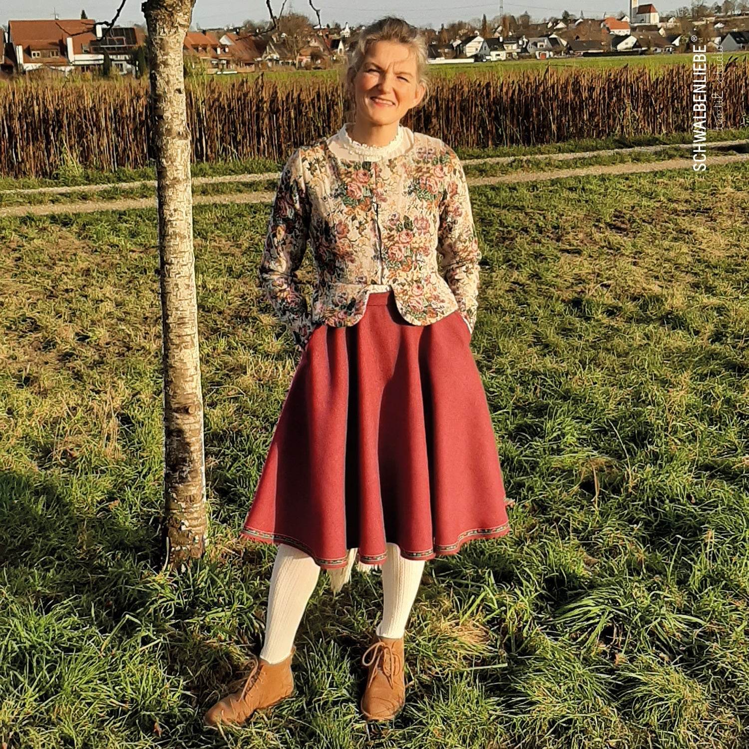 Cherry Blossom ist ein eleganter ¾-Tellerrock mit versetzten Nahttaschen, Unterrock und Reißverschluss – in den Größen 32–60. Perfekt für Alltag und besondere Anlässe, kombinierbar mit allen Schwalbenschnitten.
