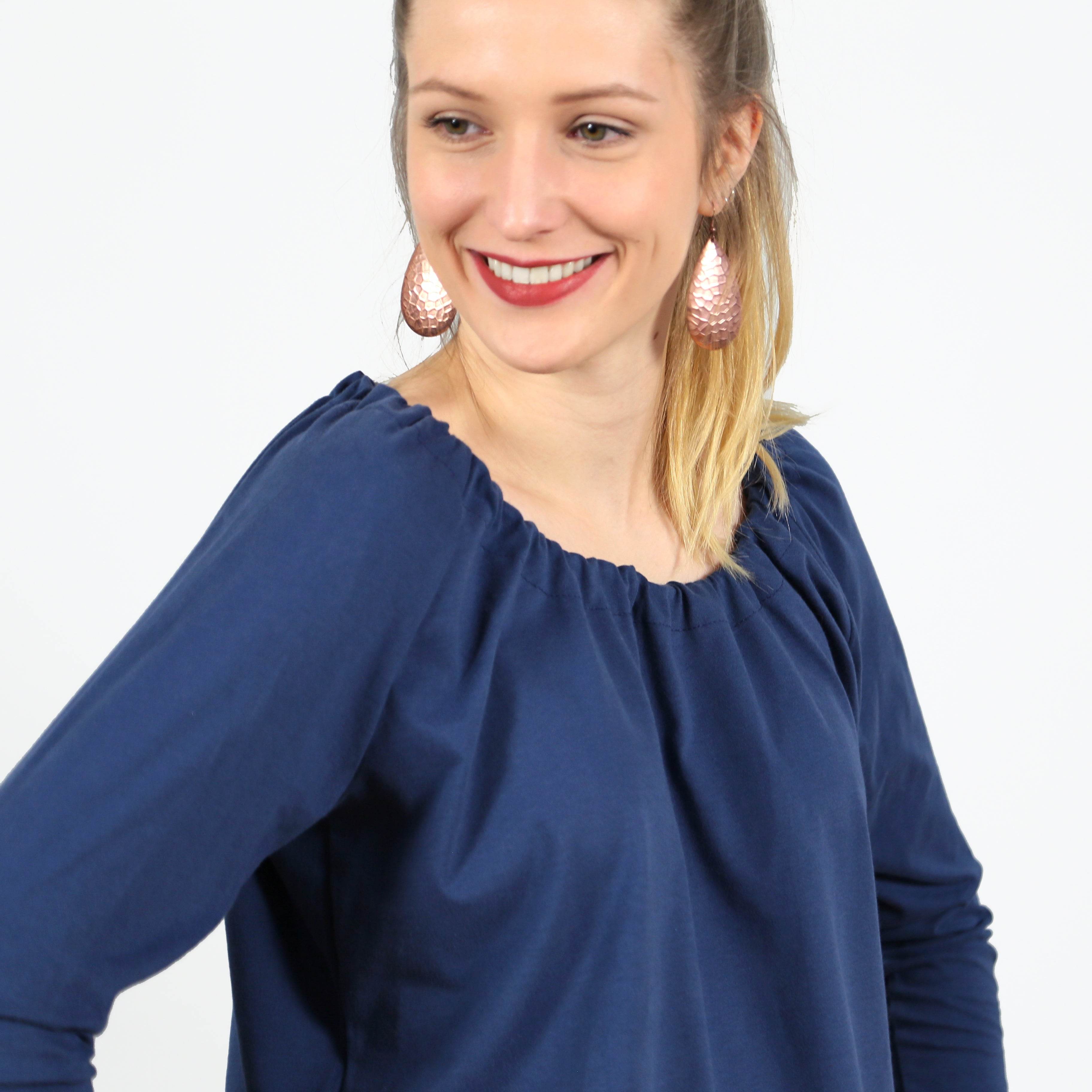 FRAU EMMA ist ab sofort immer an Deiner Seite! Das legere Raglanshirt ist so bequem, dass Du es gar nicht wieder ausziehen möchtest. Der Look mit Gummizug im Halsloch und breitem Saumbündchen ist zeitlos und überdauert so manchen Trend.Du kannst FRAU EMMA mit langen oder kurzen Ärmeln nähen, so begleitet Dich FRAU EMMA durchs ganze Jahr!