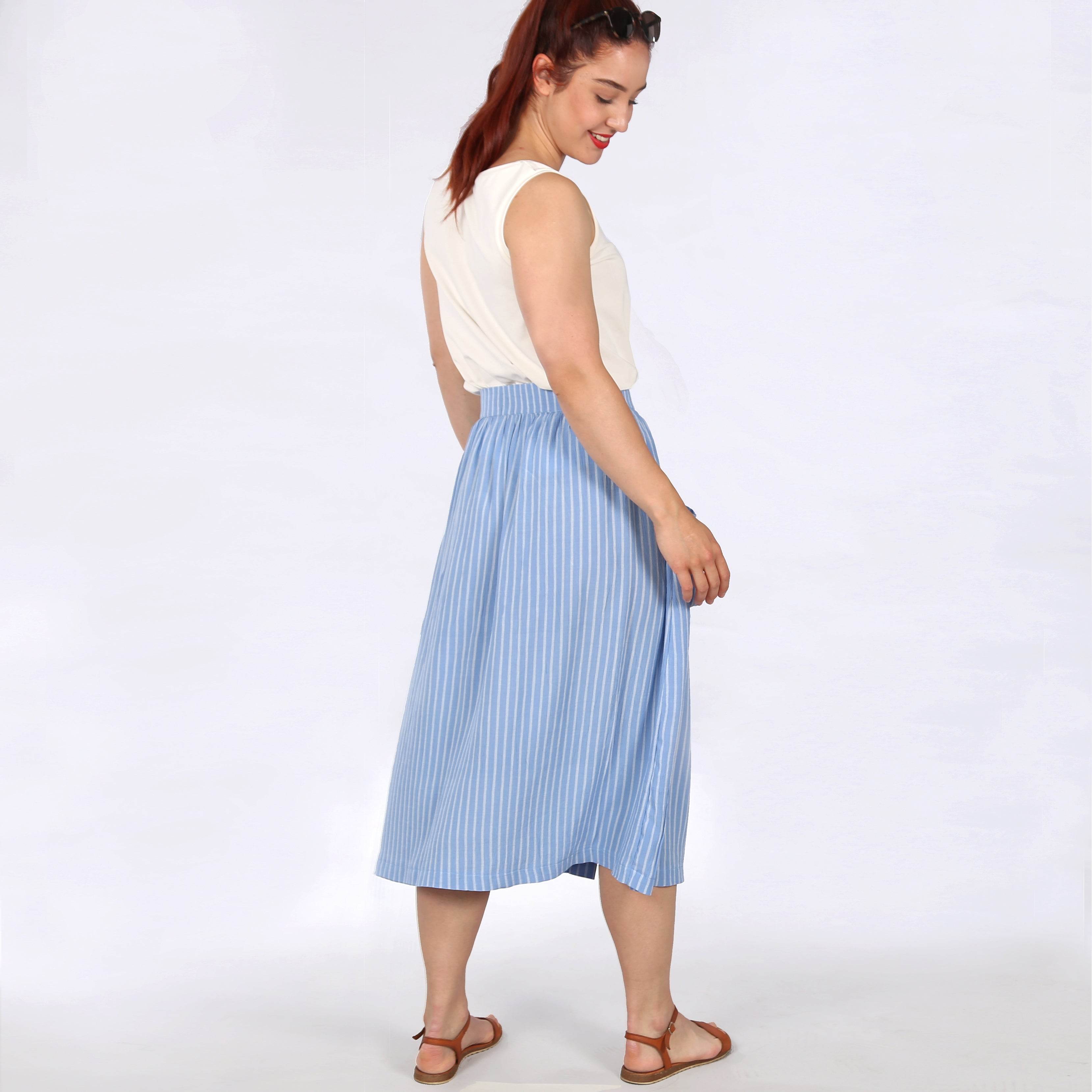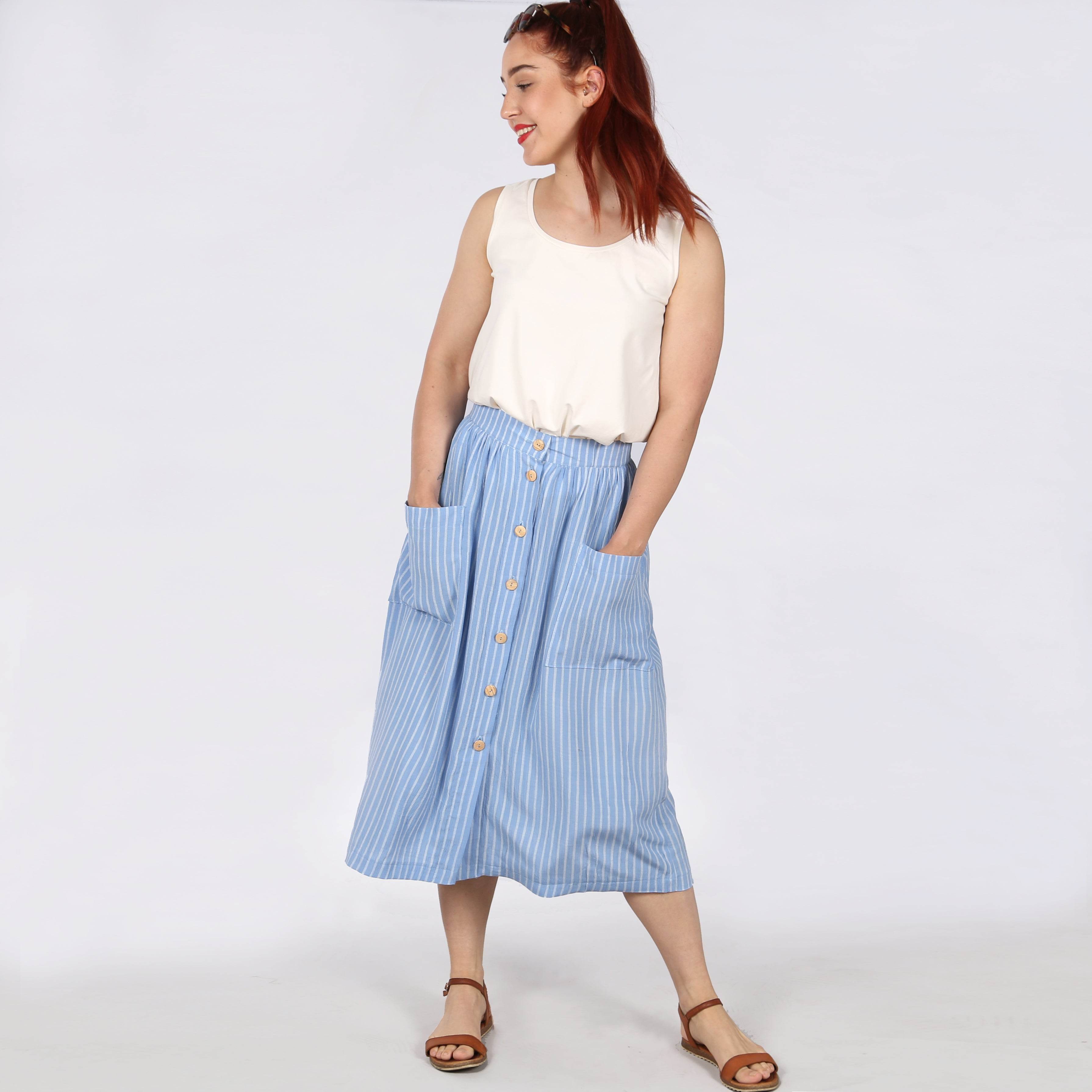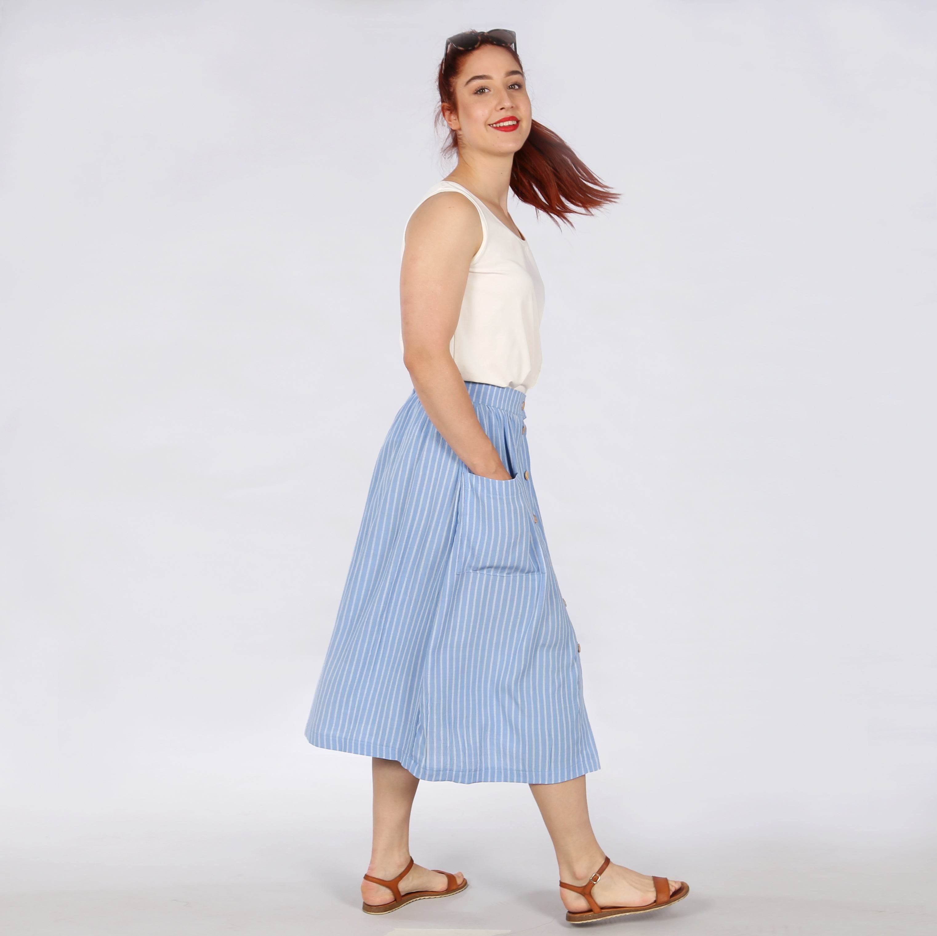 Mit FRAU FIONA kannst Du den Sommer in vollen Zügen genießen. Der schwingende Rock wird am festen Bund gekräuselt und erhält so eine luftige Weite. In der vorderen Mitte verläuft eine Knopfleiste, so lässt sich der Rock einfach an und ausziehen. Große, rechteckige aufgesetzte Taschen, die locker aufstehen, geben dem Rock einen Hauch Lässigkeit.