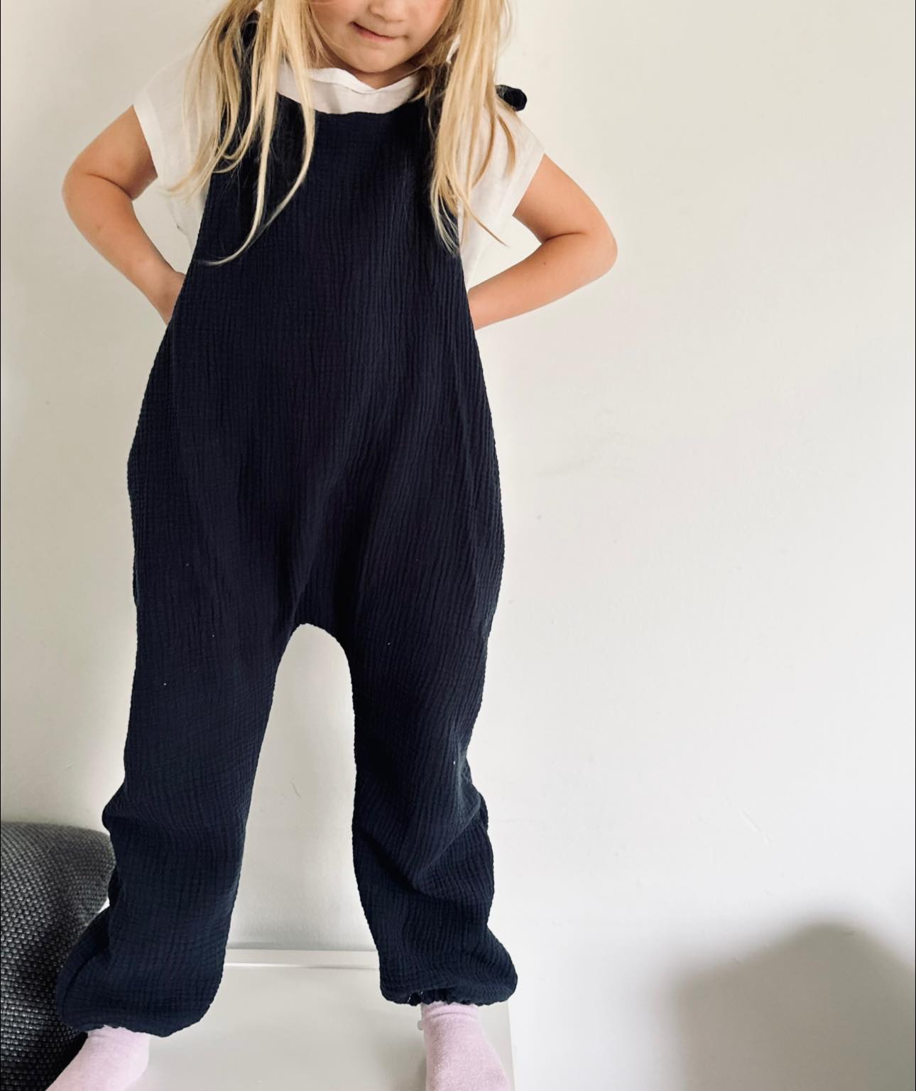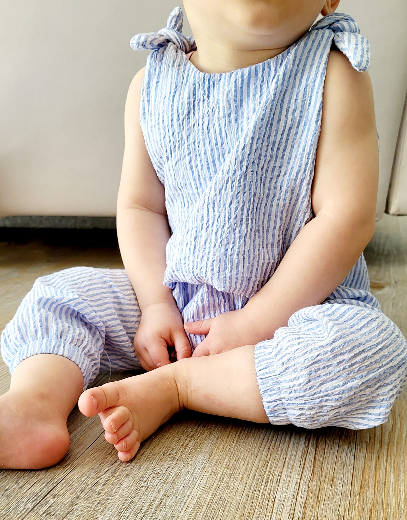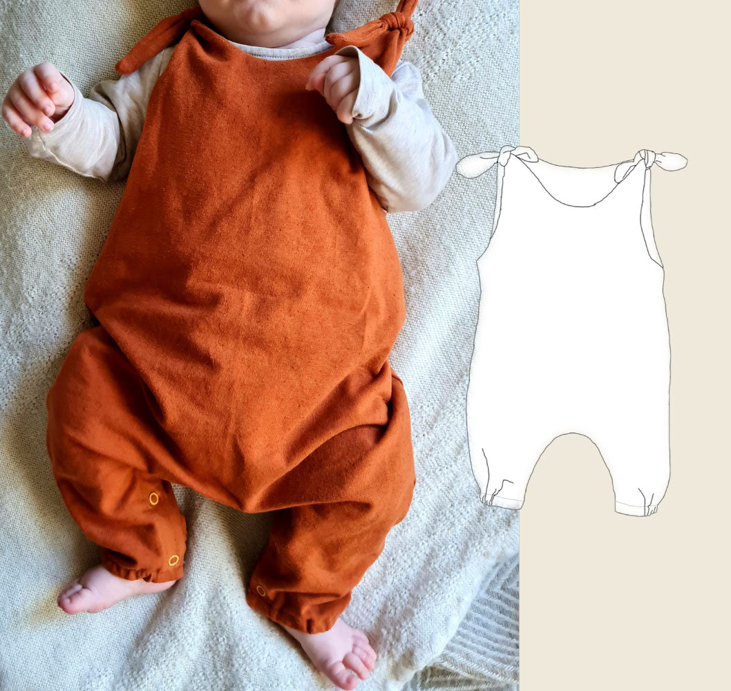 Ein absoluter Lieblingseinteiler... perfekt für nicht dehnbare Webstoffe. An den Schultern lässig geknotet kann Milo etwas in der Göße mitwachsen. Für kleine Babys haben wir an alles gedacht und du kannst du eine praktische Wickelöffnung mit Druckknopfleiste in den Schritt einnähen.