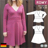 „Romy“ ist ein Wickelkleid oder Wickelshirt mit V-Ausschnitt, leicht ausgestelltem Rock und einem Taillenband, das deine Silhouette betont. Der Ausschnitt wird mit einem Beleg verstürzt und sieht besonders sauber verarbeitet aus. Optional kannst du Nahttaschen in die Seiten des Rocks einnähen.
