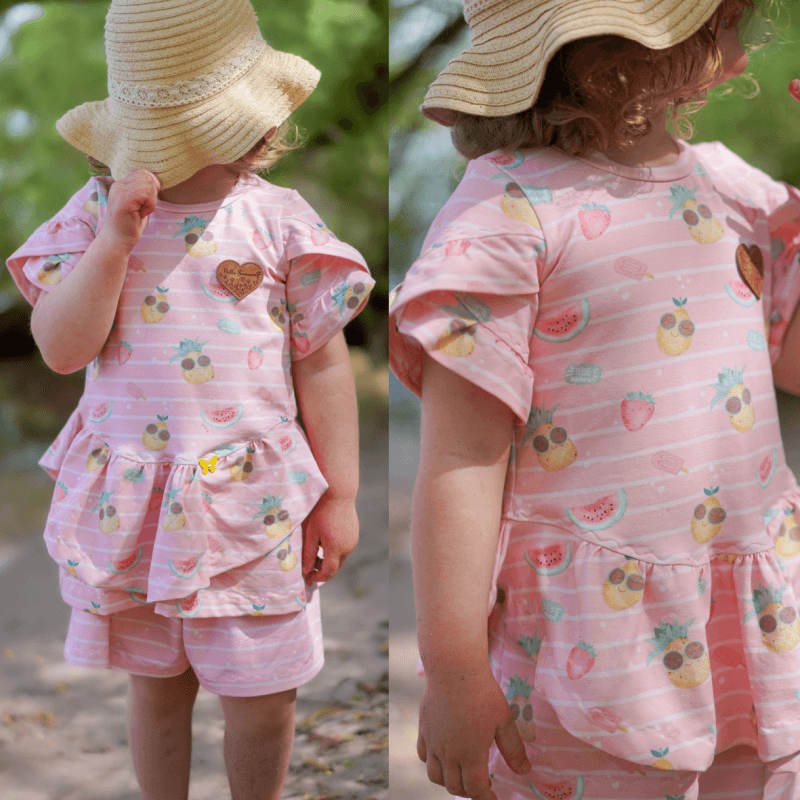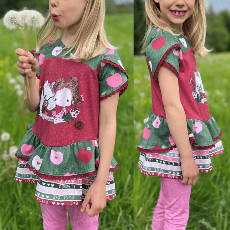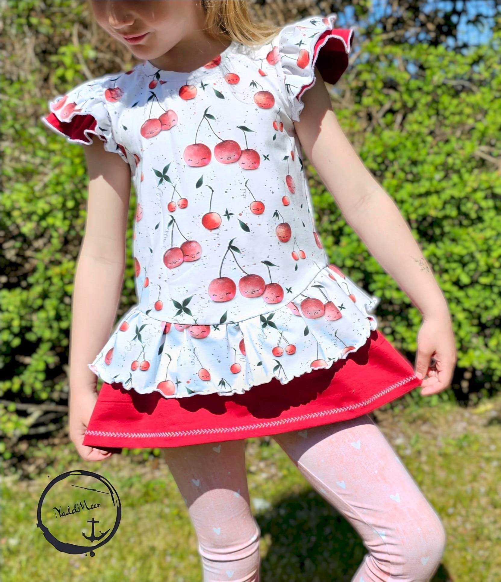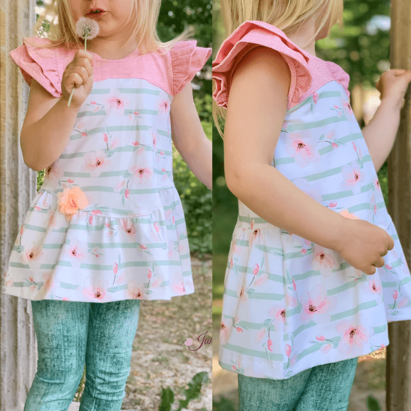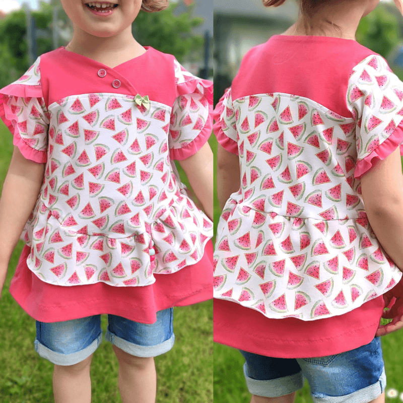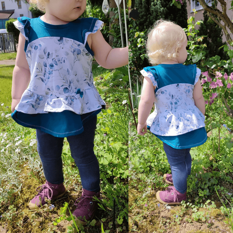 Arabella ist ein süßes Oberteil mit vielen spannenden Details. Ganz am Anfang gibt es zwei unterschiedliche Rüschenlagen, dabei eine Rüsche mit zwei unterschiedlichen Längen, welche einzeln oder kombiniert verwendet werden können. Die kürzere Rüschenlage ist bei Arabella ausgestellt, sodass sie sich stark von der zweiten, längeren Rüschenlage abhebt. Durch die beiden Rüschenlagen entsteht die Möglichkeit, das Oberteil in völlig unterschiedlichen Looks zu nähen. Zusätzlich ist das Schnittmuster mit einer kleinen Teilung versehen, welche einen alternativen Halsausschnitt ermöglicht. Ergänzt werden diese Optionen durch viele unterschiedliche Ärmel für jede Jahreszeit. Ein normaler Ärmel sowie ein Puffärmel - beide in kurz und lang nähbar - sind die Basisvarianten. Ein Tulpenärmel mit Rüsche ist die elegante Variante für Sommerlooks mit bedeckter Schulter. Ein doppellagiger Flügelärmel ist die verspielteste Version des Schnittmusters und wirkt vor allem mit dem alter- nativen Ausschnitt komibiniert einfach zauberhaft. Für dieses Schnittmuster wird für alle Rüschenlängen der Rüschenlage 1 ein Saumbeleg benötigt. Dieser wird mit Hilfe des enthaltenen Tutorials zugeschnitten. Alternativ kannst du natürlich auch einen Rollsaum anbringen. Arabella ist auf Jersey ausgelegt, kann aber mit ggf. nötigen Anpassungen auch aus French Terry genäht werden.
