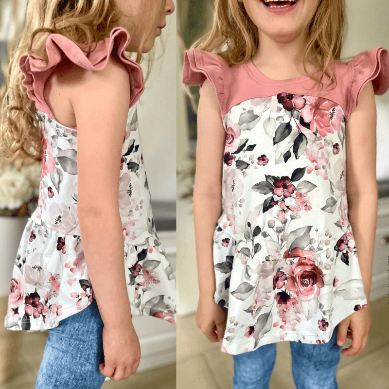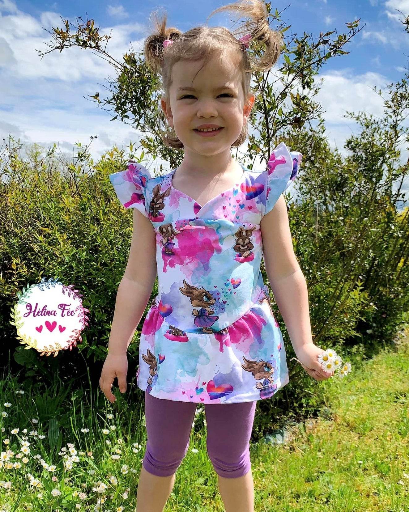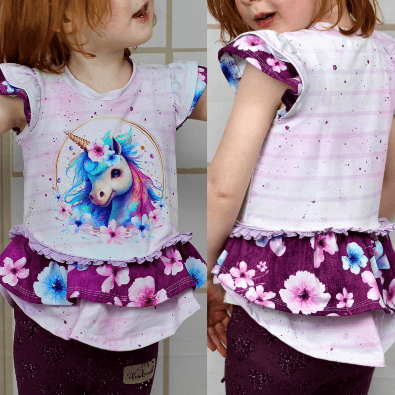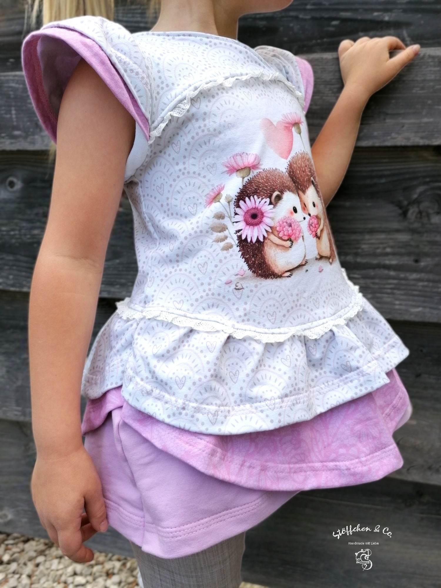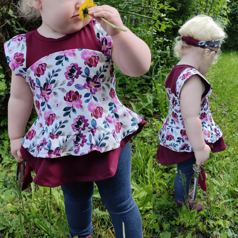 Arabella ist ein süßes Oberteil mit vielen spannenden Details. Ganz am Anfang gibt es zwei unterschiedliche Rüschenlagen, dabei eine Rüsche mit zwei unterschiedlichen Längen, welche einzeln oder kombiniert verwendet werden können. Die kürzere Rüschenlage ist bei Arabella ausgestellt, sodass sie sich stark von der zweiten, längeren Rüschenlage abhebt. Durch die beiden Rüschenlagen entsteht die Möglichkeit, das Oberteil in völlig unterschiedlichen Looks zu nähen. Zusätzlich ist das Schnittmuster mit einer kleinen Teilung versehen, welche einen alternativen Halsausschnitt ermöglicht. Ergänzt werden diese Optionen durch viele unterschiedliche Ärmel für jede Jahreszeit. Ein normaler Ärmel sowie ein Puffärmel - beide in kurz und lang nähbar - sind die Basisvarianten. Ein Tulpenärmel mit Rüsche ist die elegante Variante für Sommerlooks mit bedeckter Schulter. Ein doppellagiger Flügelärmel ist die verspielteste Version des Schnittmusters und wirkt vor allem mit dem alter- nativen Ausschnitt komibiniert einfach zauberhaft. Für dieses Schnittmuster wird für alle Rüschenlängen der Rüschenlage 1 ein Saumbeleg benötigt. Dieser wird mit Hilfe des enthaltenen Tutorials zugeschnitten. Alternativ kannst du natürlich auch einen Rollsaum anbringen. Arabella ist auf Jersey ausgelegt, kann aber mit ggf. nötigen Anpassungen auch aus French Terry genäht werden.