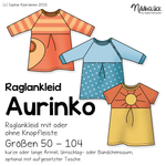 Das Kleid Aurinko ist ein Raglankleid, welches mit Tasche und oder Knopfleiste ausgestattet werden kann. Es besitzt vorn und hinten eine Kellerfalte. Die Ärmelsaumkanten können mit Bündchen oder durch Umschlagen genäht werden. Für die Ärmel gibt es eine lange oder kurze Variante.