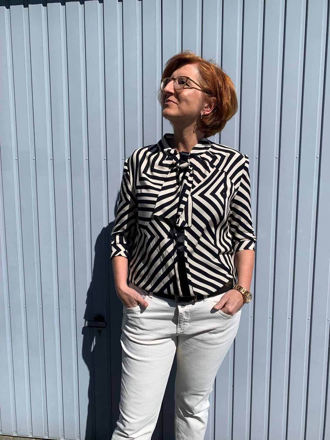 Dieser Schnitt für eine elegante, lockere und feminin oder streng gestaltbare Damen Bluse aus Webware, wie z.B. Viskose, mit abnehmbarer Schluppe/Schleife und verschiedenen Ärmellängen, sowie einer ärmellosen Variante, trägt den schönen Namen "Blüte der Vielfalt". Die formgebenden Brust und Schulterabnäher sind in Falten gelegt, sodass es in der Passform keinerlei Einbuße gibt. Das Schnittmuster beinhaltet natürlich eine ausführliche Anleitung und die Damen Größen 32 - 62 und wird dir nach dem Kauf als Sofort Download in PDF Format zur Verfügung gestellt.