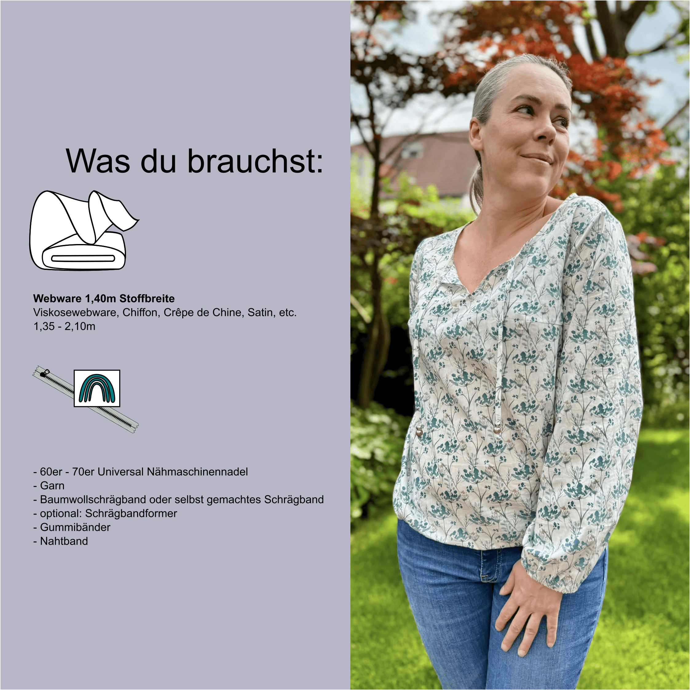 • Als Material eignet sich Viskosewebware, Chiffon, Crêpe de Chine, Satin, Seersucker, etc..