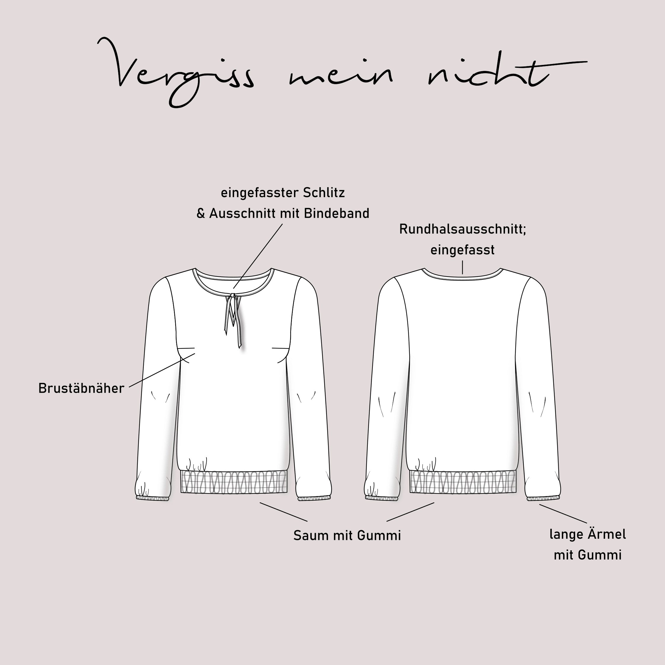 Dieser Schnitt für eine lockere, sehr bequeme und schnell genähte Damen Bluse aus Webware, wie z.B. Viskose, mit knotbarer Einfassung, kleinem Schlitz, Brustabnähern und Säumen mit Gummiband, trägt den schönen Namen "Vergiss mein nicht". Das Schnittmuster beinhaltet natürlich eine ausführliche Anleitung und die Damen Größen 32 - 62 und wird dir nach dem Kauf als Sofort Download in PDF Format zur Verfügung gestellt.