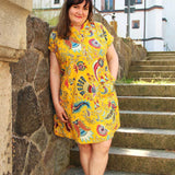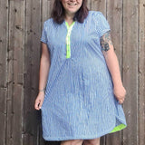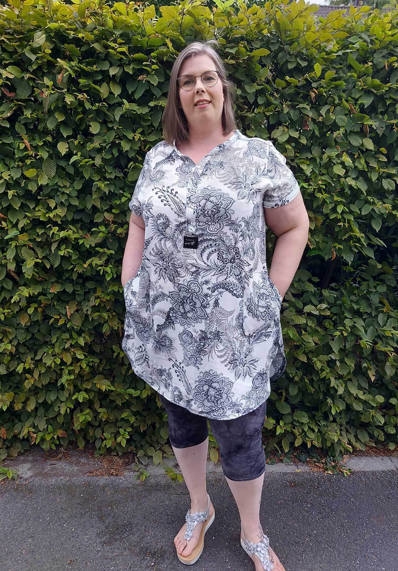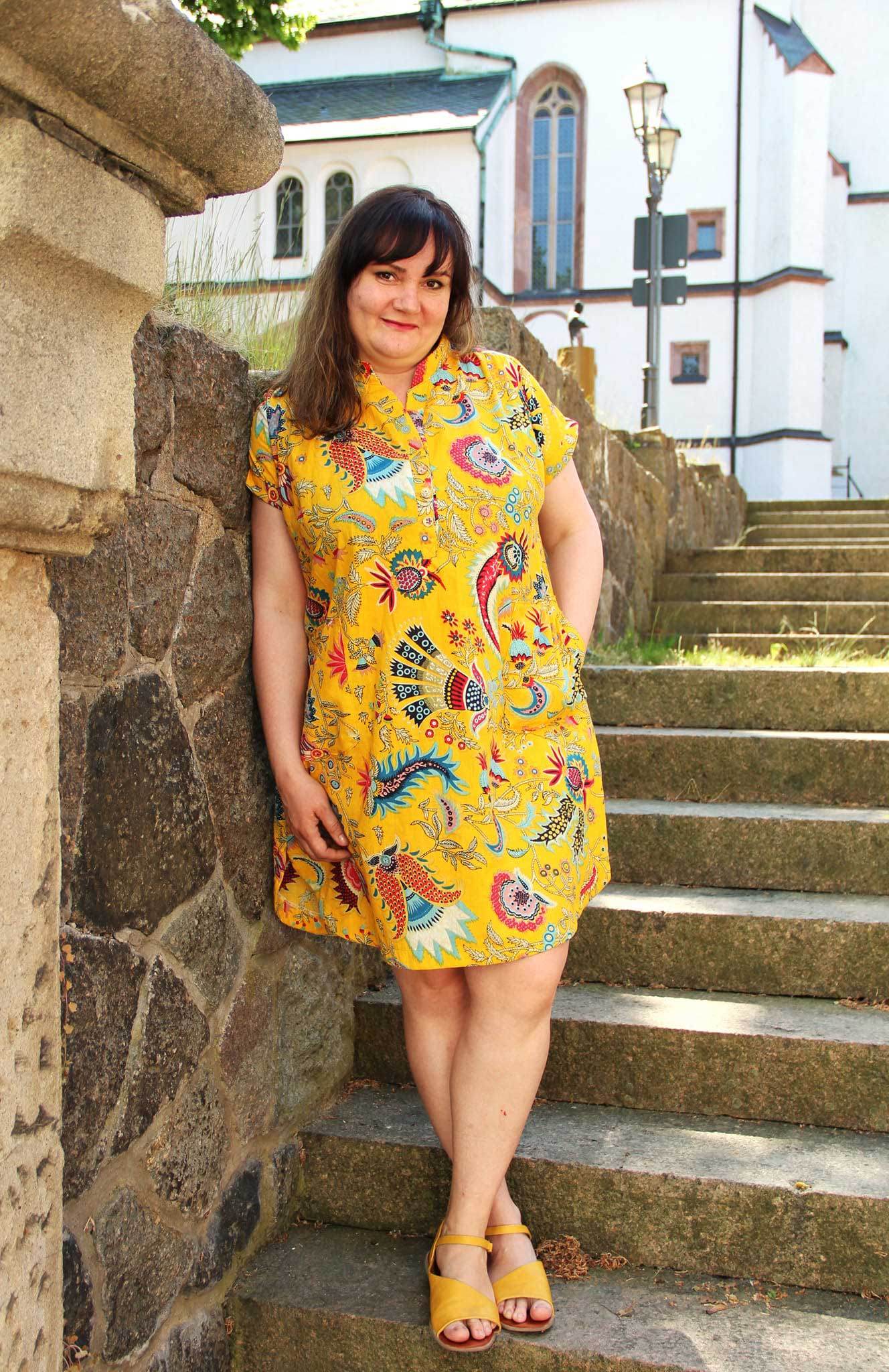 Curiola ist ein schönes, locker sitzendes Hemdkleid mit Knopfleiste, kleinem Stehkragen, einer Raffung an der Schulter und kurzen Ärmeln. Die Länge des Kleides beträgt ca. 100cm. Die Kellerfalte im Rücken kreiert eine lockere Passform, mit den optionalen Abnähern im Rücken kann das Kleid leicht tailliert werden. Der gerundete Saum wird mit Belegen gearbeitet. Das Schnittmuster enthält optionale, aufgesetzte Taschen.