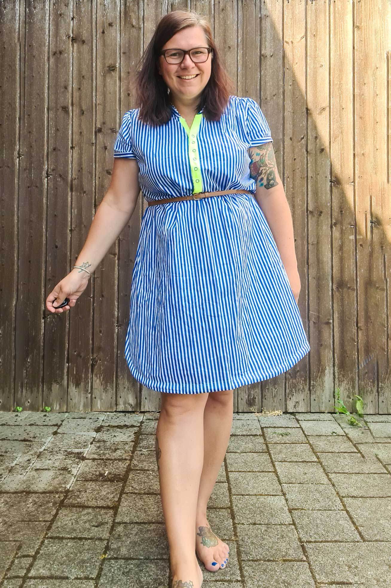 Schnittmuster zum Nähen eines schönen Hemdkleides mit Knopfleiste, Stehkragen, kurzen Ärmeln und aufgesetzten Taschen