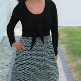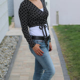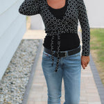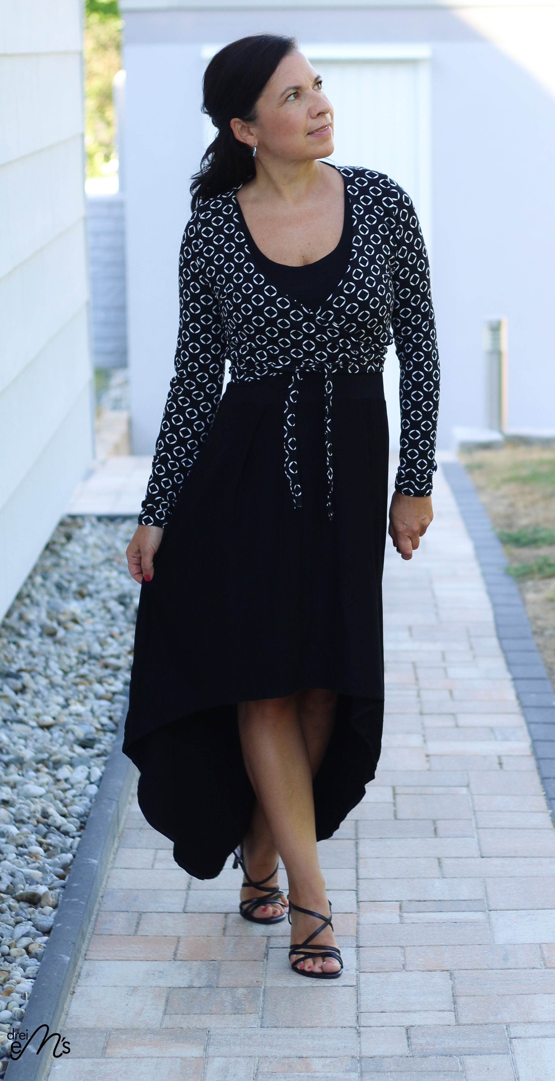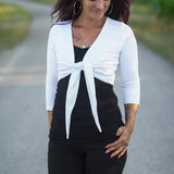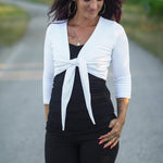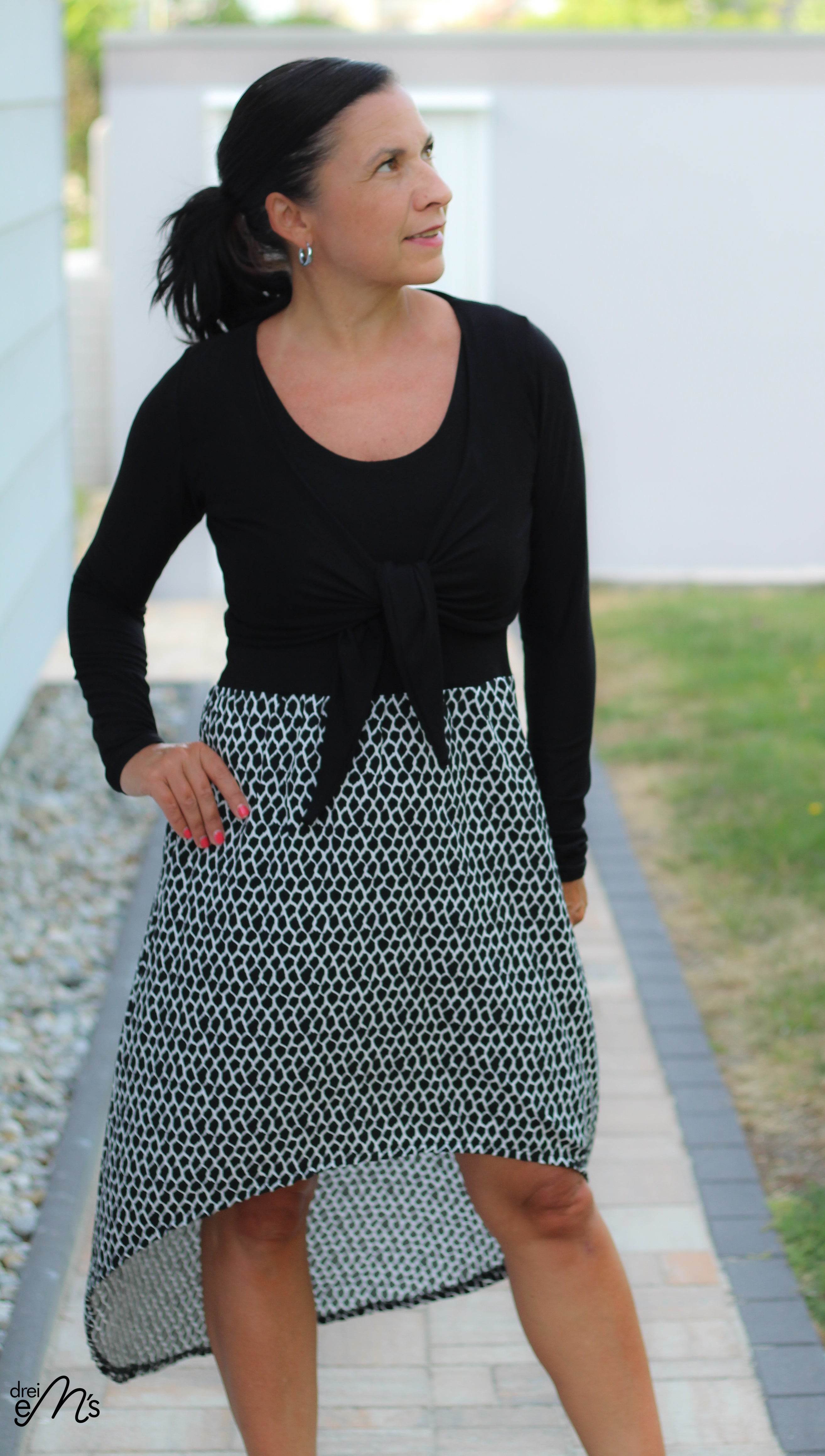 Du kannst das Jäckchen vorn verknoten oder mit längeren Bändern auch gewickelt tragen. Ebenso sind 3 Ärmellängen enthalten : langarm. 3/4 arm und kurzarm.