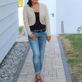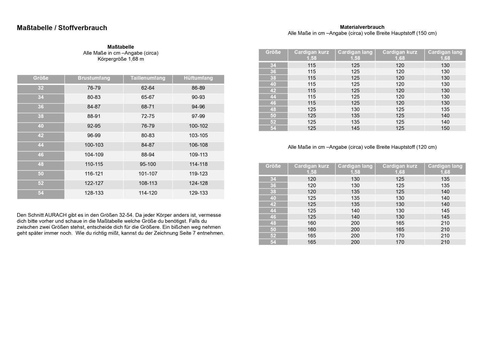AURACH bekommst du in den Größen 34-54. Dieser Cardigan ist ganzjahrestauglich. Egal ob zur Jeans oder zum Kleid, alles ist möglich. Du kannst zwischen zwei Längen wählen: Crop-Länge oder normale Länge (ca. Gürtellänge). Ebenso kannst du die Ärmel säumen oder mit einem Bündchen nähen. Das umlaufende Bündchen/Beleg hat eine besondere Form, es ist nicht einfach nur ein Streifen. Somit legt sich alles gut an und steht später nicht ab. Es sind zusätzlich zwei verschiedene Längen für eine Körpergröße: 1,58m, 168m enthalten. Wobei die 1,68er Länge auch für große Frauen sehr gut sitzt.