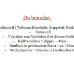 Carry ist eine einfache, schlichte Bauch- /Brusttasche , die aus nur einem Schnittteil besteht und somit als Basicschnitt dient. Du kannst sie sowohl mit Futter als auch ohne nähen. Ich empfehle Taschenstoffe , welche stabil und fest genug sind. So kannst du auf eine Verstärkung durch Vlieseline verzichten und ggf. sogar auf´s Futter. Die Innennähte sind bei der Taschenversion sichtbar, d.h. Du solltest sauber und ordentlich nähen und die Nahtzugaben ggf. versäubern. Auch beim Reißverschluss solltest du langsam und sauber arbeiten, da auch diese Nähte sichtbar sind.