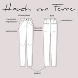 Dieser Schnitt für eine Chinohose mit schrägen Eingrifftaschen, Leistentaschen im Gesäßbereich und einer Leistentasche vorne rechts für den 5-Pocket-Stil, einem festen Bund mit Hosenreißverschluss und einem mäßig weiten Bein (regular fit), trägt den schönen Namen "Hauch von Ferne". Das Schnittmuster beinhaltet natürlich eine ausführliche Anleitung und die Damen Größen 32 - 54 und wird dir nach dem Kauf als Sofort Download in PDF Format zur Verfügung gestellt.