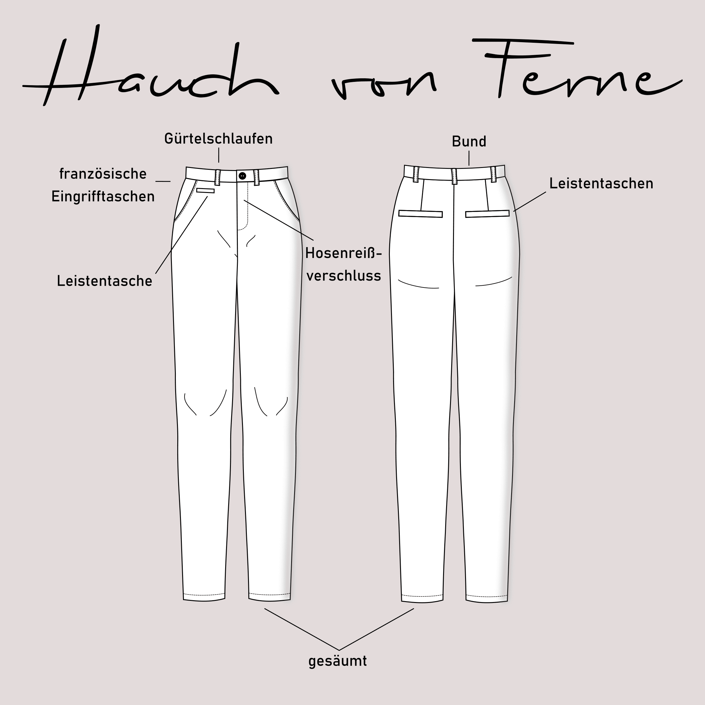 • Als Material eignet sich Hosenstoffe wie z.B. Baumwolltwill, Baumwollköper, Leinen-Mischgewebe, Leinen, Jeans (nicht zu dick), Cord, und viele weitere (max. 3% Elasthan), sowie Baumwollstoffe für die Taschenbeutel und den inneren Bund