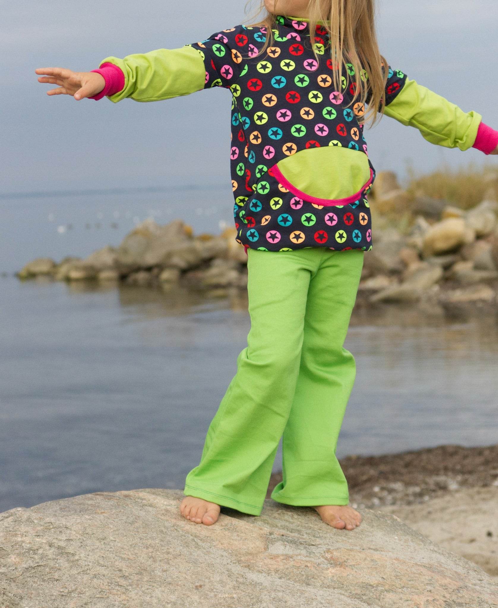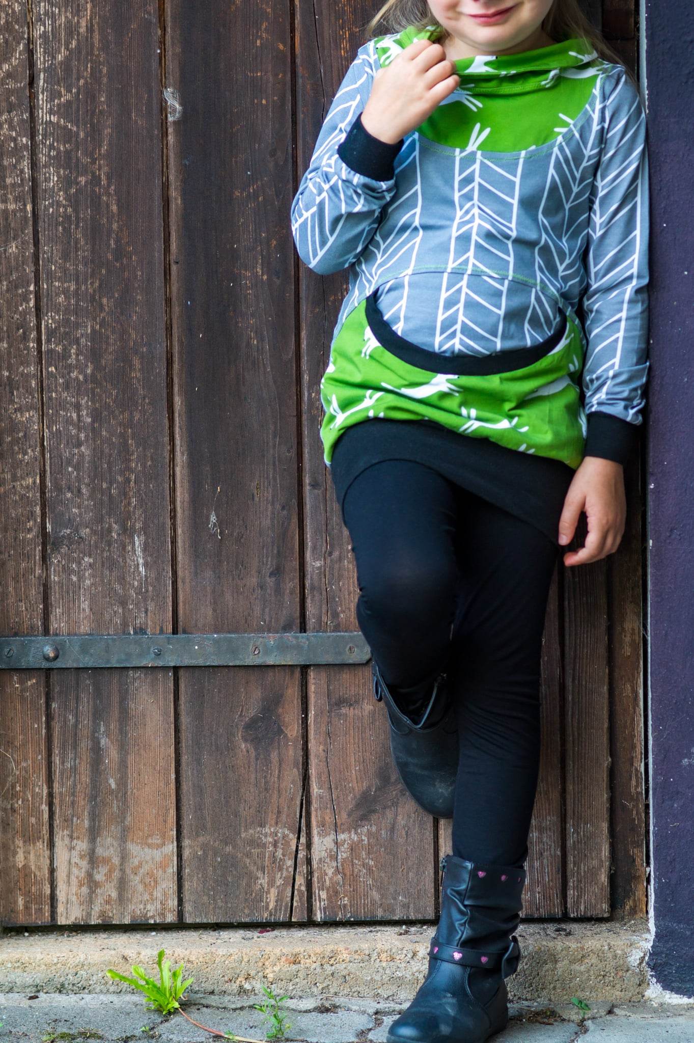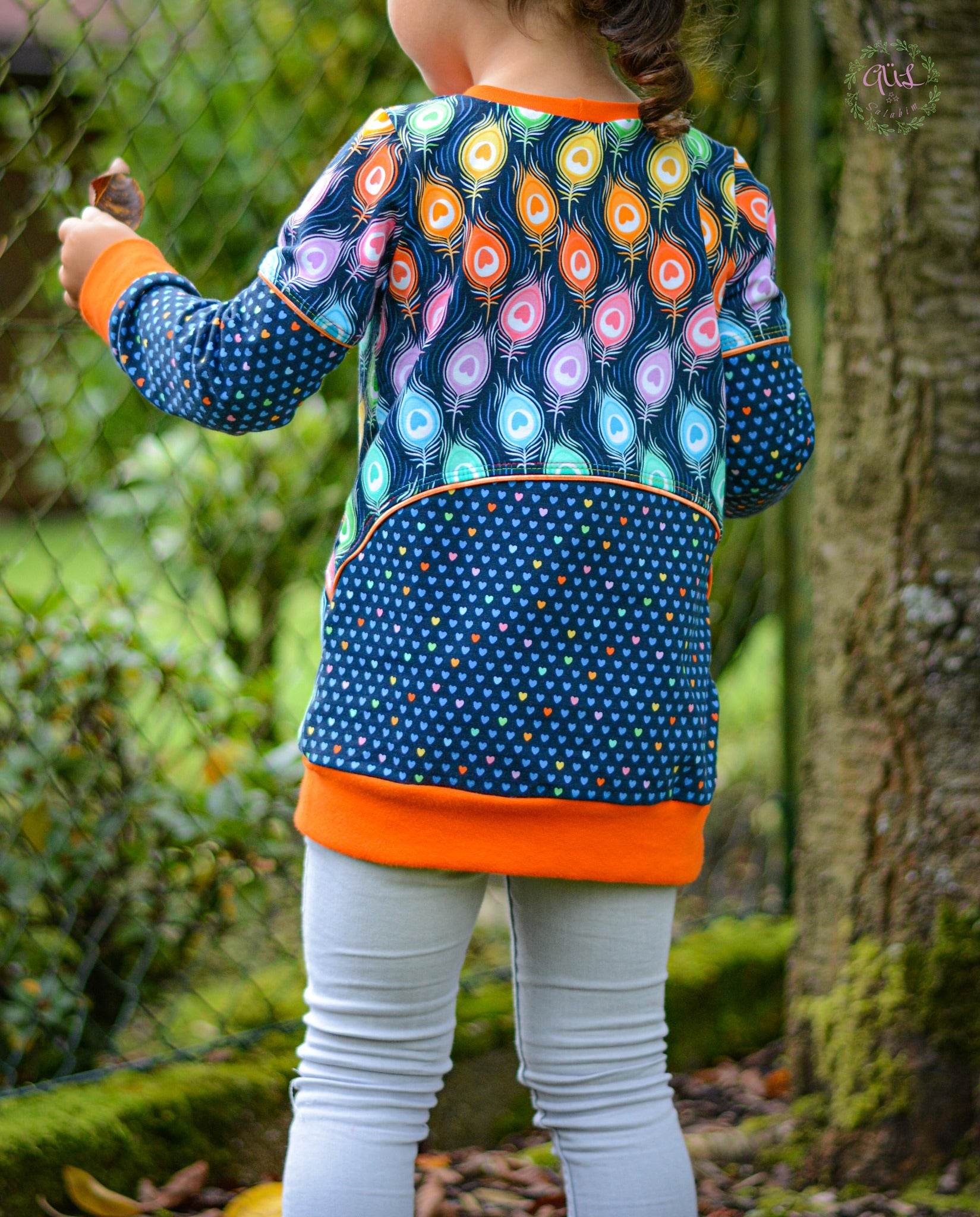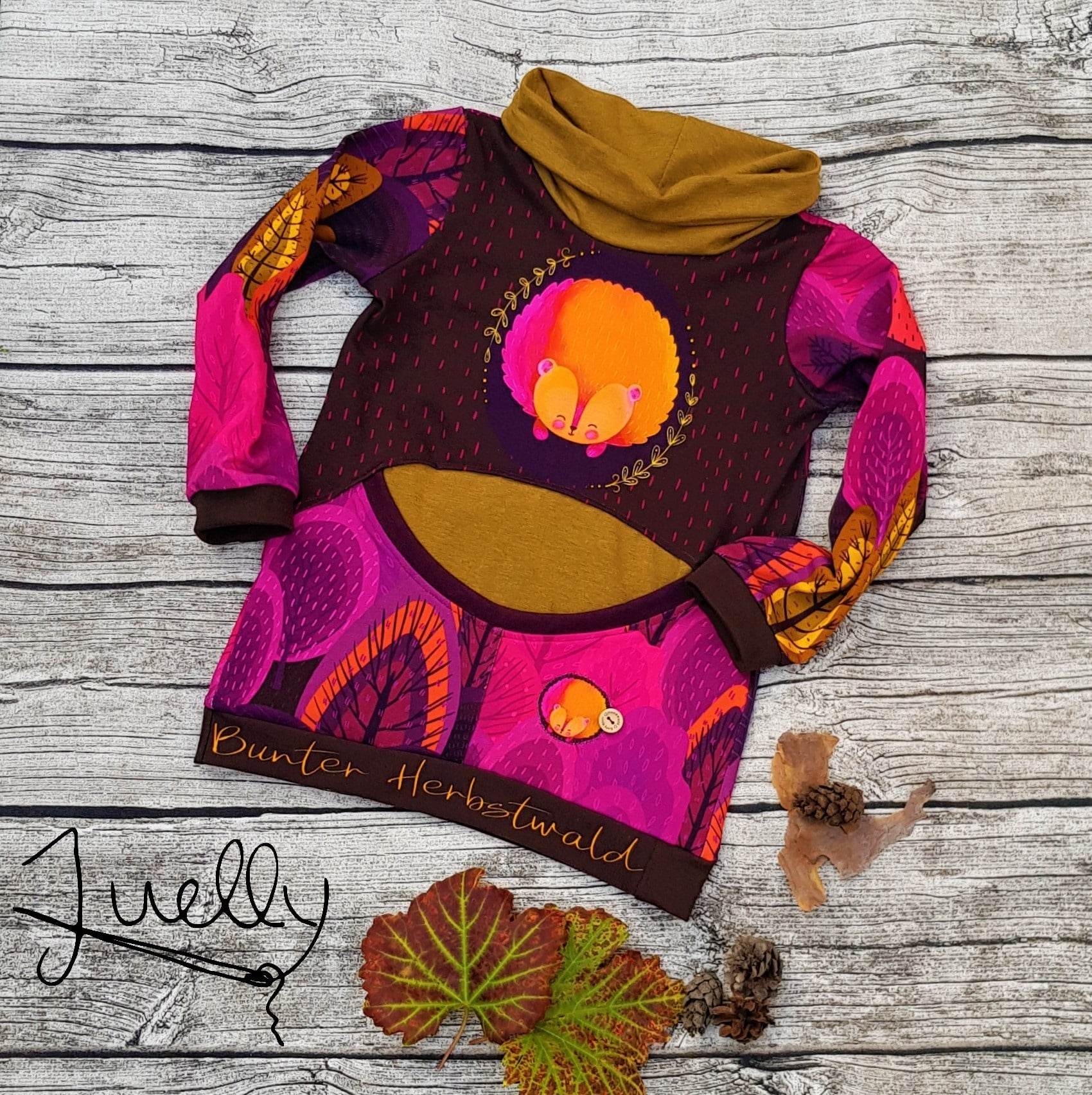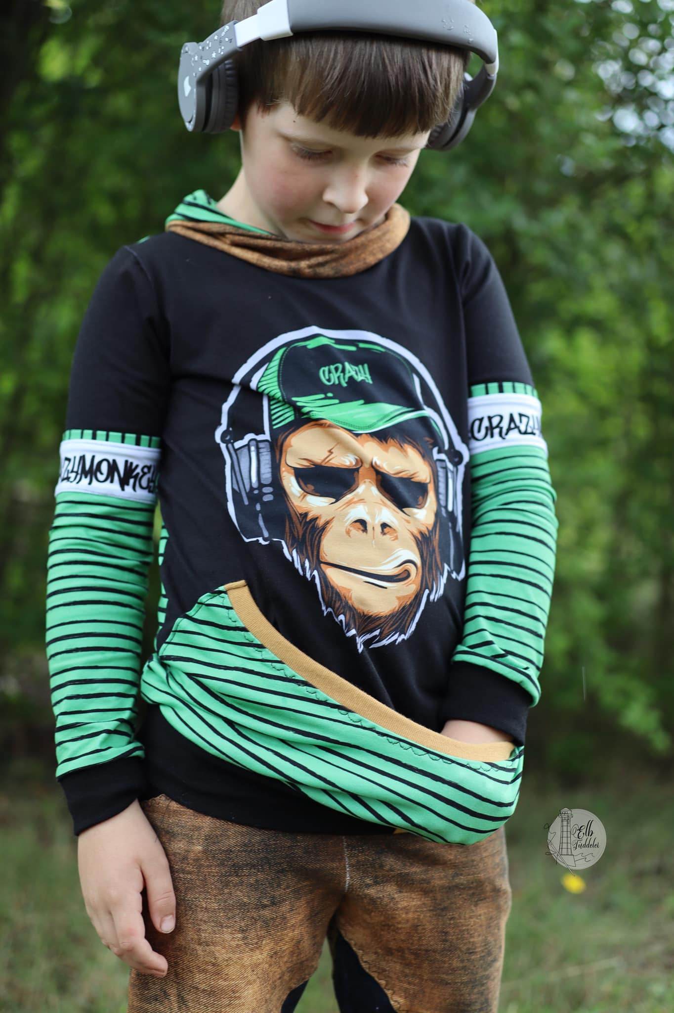 Coolbag ist ein Pulli mit großer Tasche und vielen Teilungsmöglichkeiten. Die große Tasche am Abschluss des Pullis wird durch eine kleine unsichtbare Naht in der Mitte fixiert und lässt viel Raum um kleine Dinge wie Steine, Eicheln, Kastanien usw. zu sammeln. Die Tasche kann entweder in die Teilungen integriert werden oder, falls du ein Panel hast, dass sich optisch in die Teilungen einfügt, auch aufgenäht werden. Versehen mit einem Bündchen amTascheneingriff, hängt sie nicht herunter, sondern bleibt stabil am Shirt deines Kindes. Coolbag bietet neben der Teilung, in welche die Tasche integriert ist, weitere spannende Teilungen, welche du ganz nach Belieben auswählen kannst oder einfach alle umsetzen! Abgerundet wird das Schnittmuster durch Bündchen am Abschluss sowie den Ärmelabschlüssen. Die lockere Passform sorgt für bequemen Tragekomfort. Als kleines Highlight gibt es noch drei verschiedene Krägen mit vier unterschiedlichen Umsetzungsmöglichkeiten, welche dir im Ebook genau beschrieben werden.
