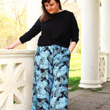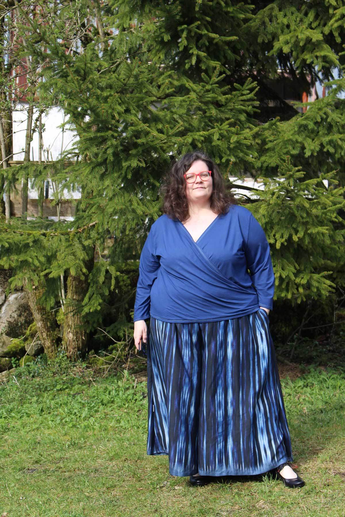 Azur ist eine bequeme, weit fallende Culotte mit großen Nahttaschen und Gummibund. Die Hose wird in der Taille getragen und ist lang geschnitten. Die Länge kann individuell angepasst werden. Die Culotte kann – je nach Stoffwahl – ganzjährig getragen werden. Aus nicht dehnbaren, leichten Stoffen, wie Viskose und Baumwolle im Frühjahr und Sommer – aus dickerer, weich fallender Webware in den kühleren Jahreszeiten.