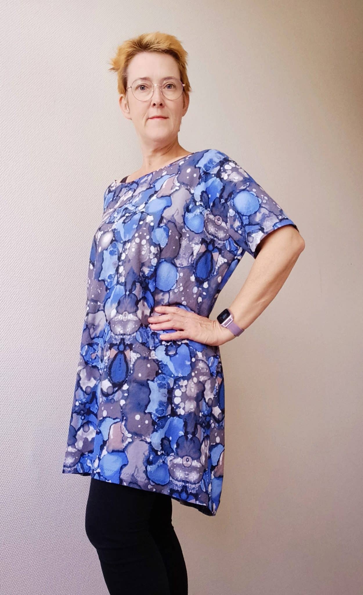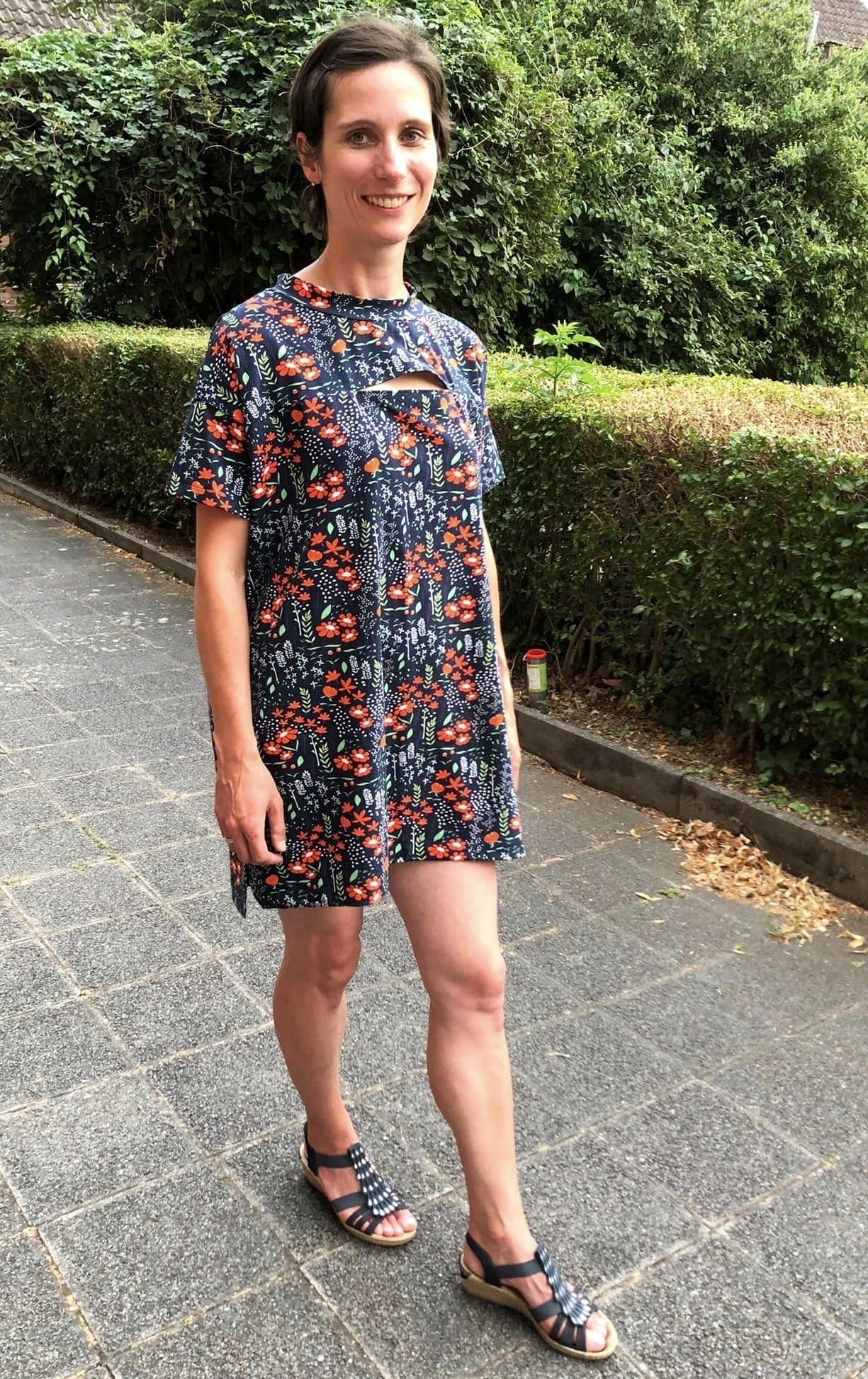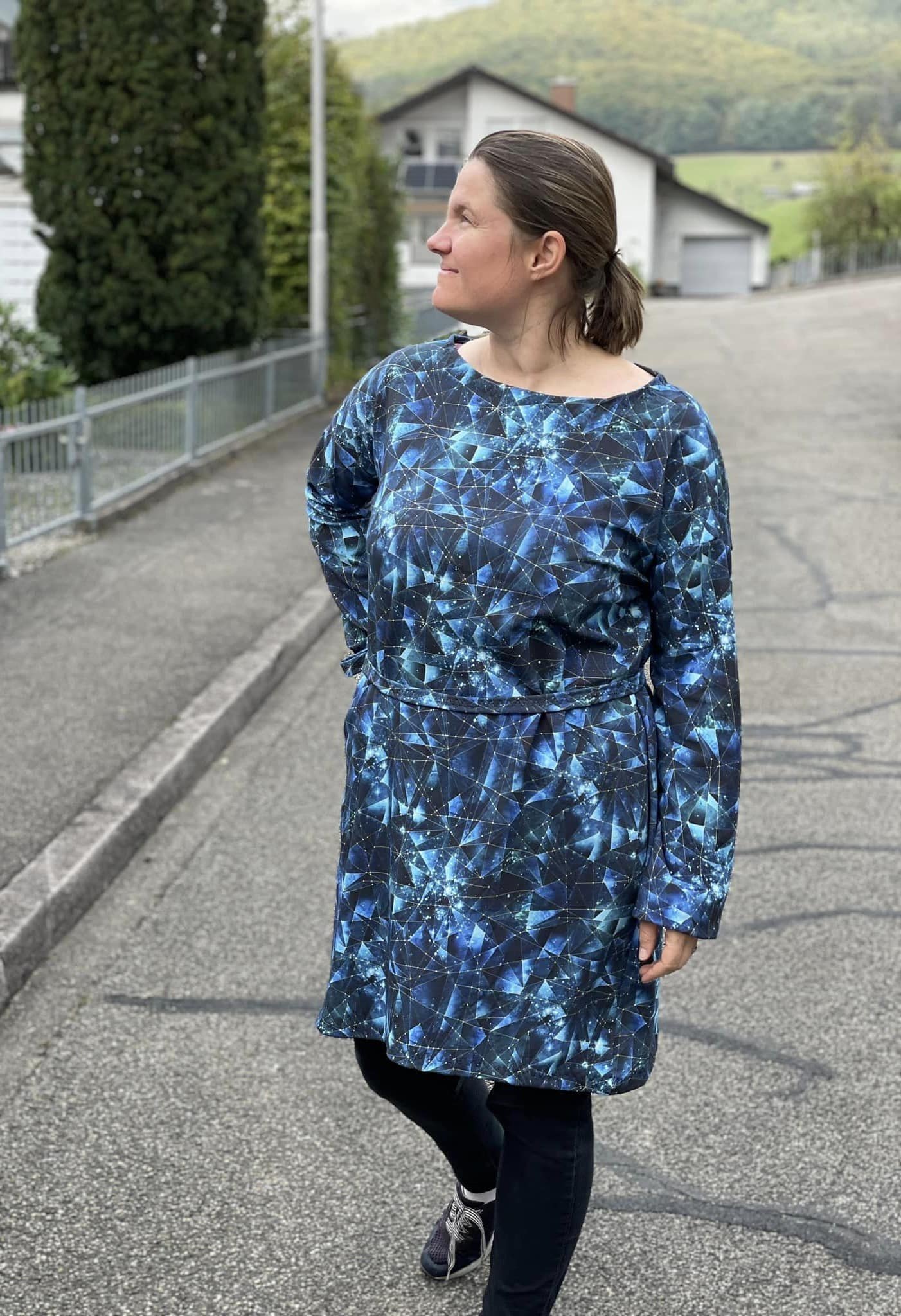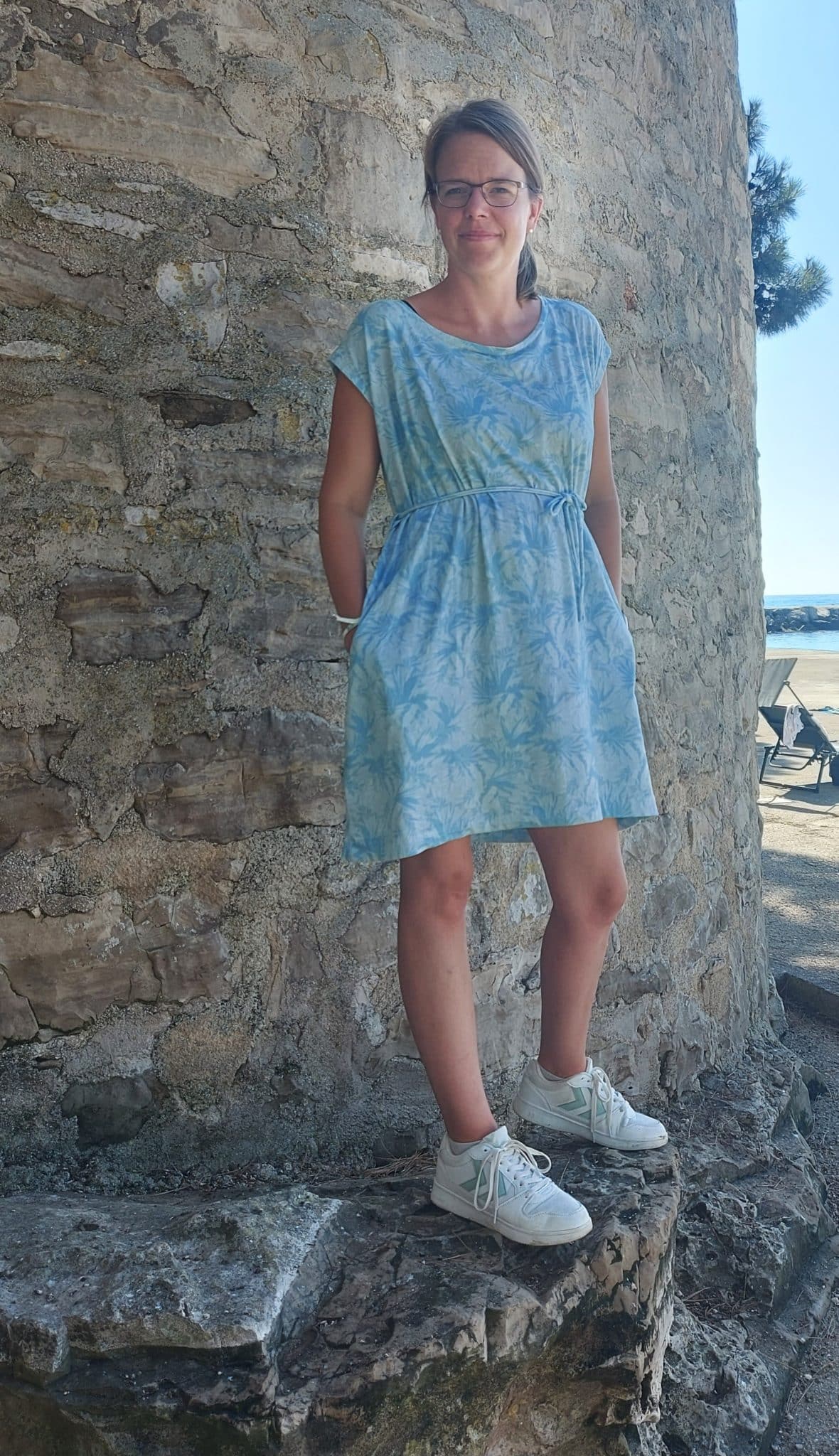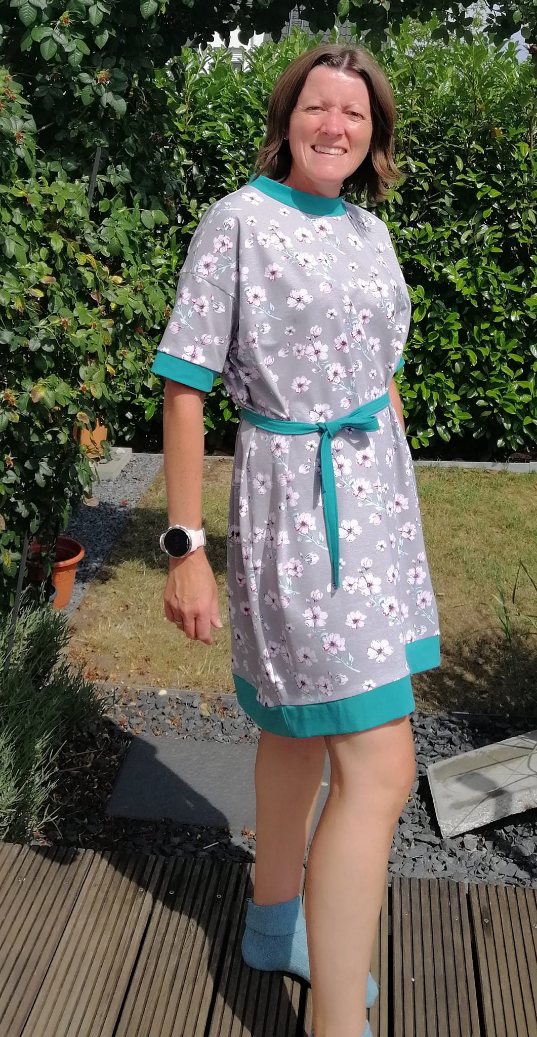 - Im Probenähen wurde das Kleid aus Viskosejersey, Baumwolljersey, Sweat (verschiedene Dicken), Musselin, Leinen, Baumwolle & Frottee genäht.