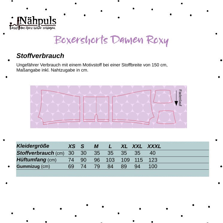 Nutzungsrecht: Der Verkauf genähter Kleidungsstücke nach dem Ebook Boxershorts Damen Roxy ist in einer Kleinserie von bis zu 20 Exemplaren gestattet. Weitergabe, Tausch oder Vervielfältigung von Schnittmuster oder Tutorial ist verboten. Alle Rechte liegen bei Nähpuls.