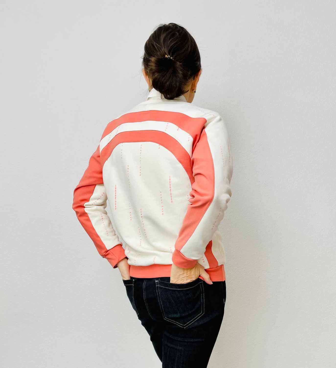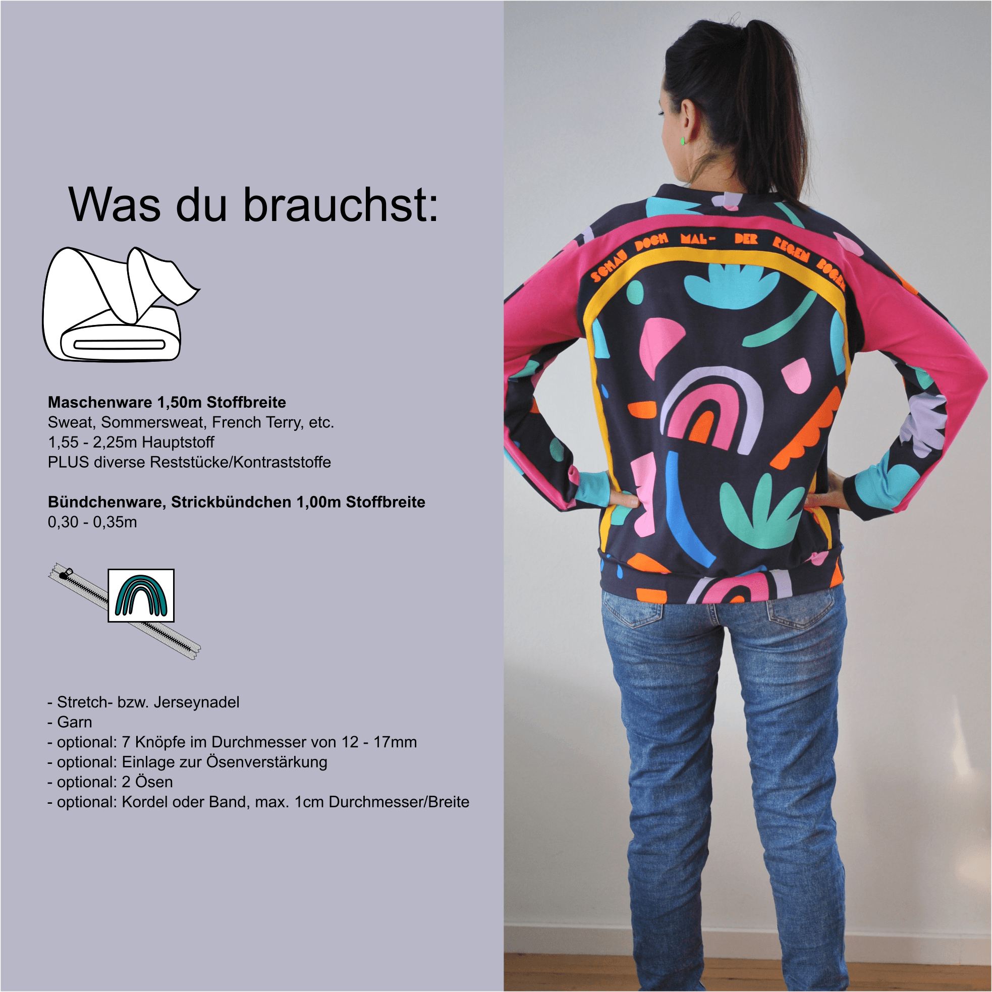 • Als Material eignen sich Sweat, French Terry, mittelschwere Strickstoffe, Strickjaquard, etc. und evtl. Bündchenware.