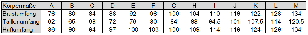 Die Schnittkomponenten sind in den Größen A-M (Brustumfang 76-134cm) gradiert.