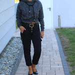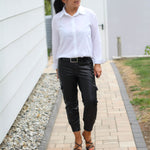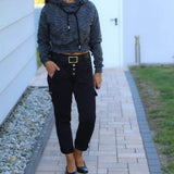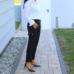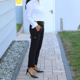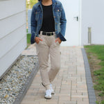 Die Hose ELLBACH kannst du in den Größen 34-54 nähen. Die Hose hat eine seitliche Teilung mit aufgesetzter Tasche (diese musst du nicht zwingend nähen). Ebenso enthält die Hose Seitentaschen und hinten eine Passé. Die Hose enthält 2 Längen (1,58m und 1,68m) . Die Längen sind dann nochmals unterteilt in Knöchellänge mit Bündchen oder gesäumt, normale Länge mit Bündchen oder gesäumt. Der Schnitt enthält auch eine Sperrlinie um zu verlängern oder zu kürzen.