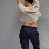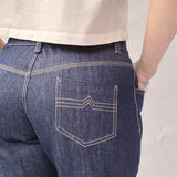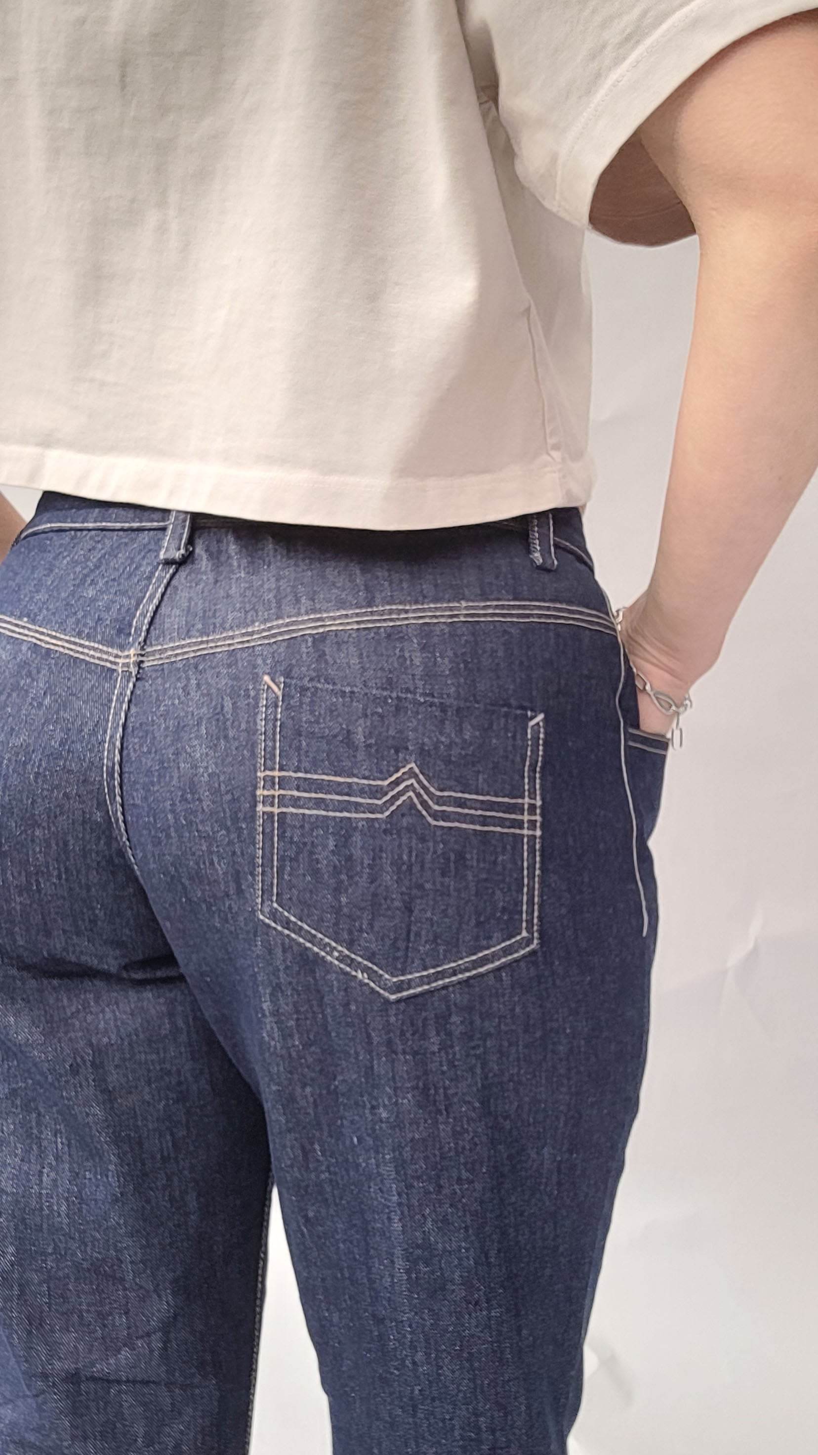 Dieses Schnittmuster für die Jeans zeichnet sich durch eine äußerst lockere und legere Passform aus. Der Bund sitzt ca. 5 cm unterhalb der Taille. Praktische Taschen auf beiden Seiten bieten zusätzlichen Komfort, während sich auf der rechten Seite ein separates Münzfach mit einer Lasche und einem Knopf befindet. Die rückwärtigen Hosenbeine bestehen aus zwei Teilen, nämlich dem Hosenbein selbst und einer Passe. Auf der Rückseite sind aufgesetzte Taschen angebracht. Die Jeans wird durch einen Reißverschluss und einem Knopf sicher geschlossen.
